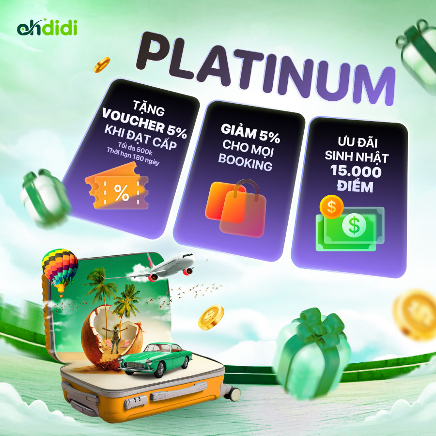 Cấp cao nhất – Platinum – dành cho những tín đồ du lịch “chuyên nghiệp”: chỉ cần 15 booking hoặc chi tiêu 30 triệu đồng trong 2 năm. Lúc này, bạn được giảm 5% cho mỗi booking, tặng voucher 500.000đ và 15.000 điểm sinh nhật – phần thưởng xứng đáng cho sự đồng hành bền bỉ.