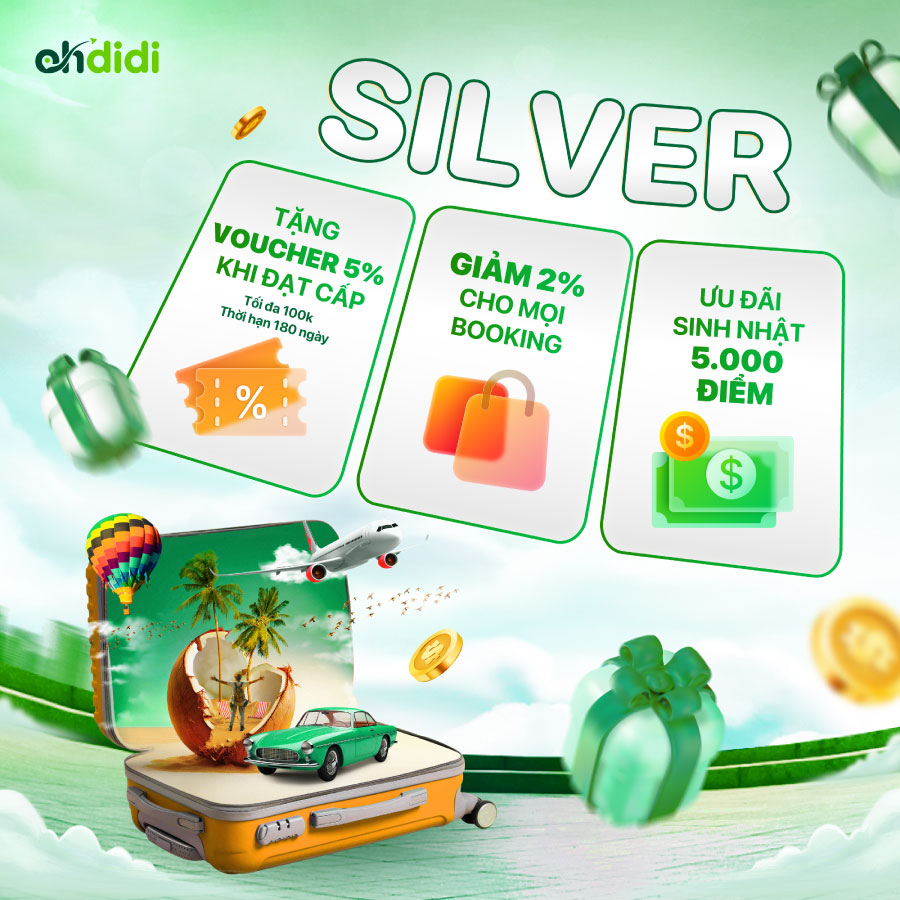 Lên Silver, bạn chỉ cần đạt từ 3 booking trong năm hoặc chi tiêu tối thiểu 5 triệu đồng. Ở cấp này, bạn đã được giảm thêm 2% cho mỗi đơn đặt phòng, tặng kèm voucher 5% tối đa 100.000đ và 5.000 điểm sinh nhật.