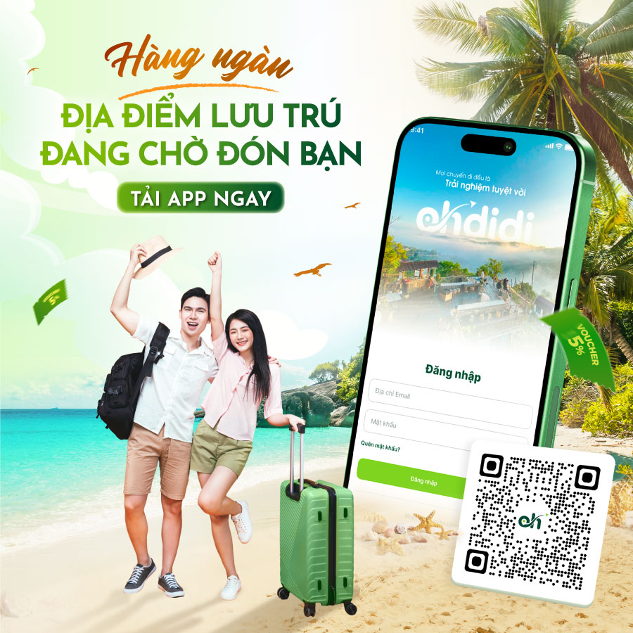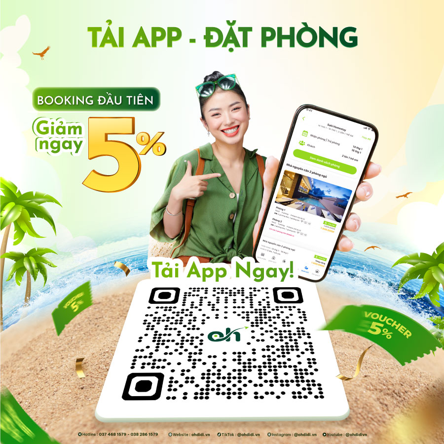 Ứng dụng Ohdidi hiện đã có mặt trên app Store và Google Play. Chỉ cần tải app, đăng ký tài khoản và bắt đầu hành trình của bạn. Ưu đãi 5% đang chờ bạn trong lần đặt phòng đầu tiên – dễ dàng, nhanh chóng.