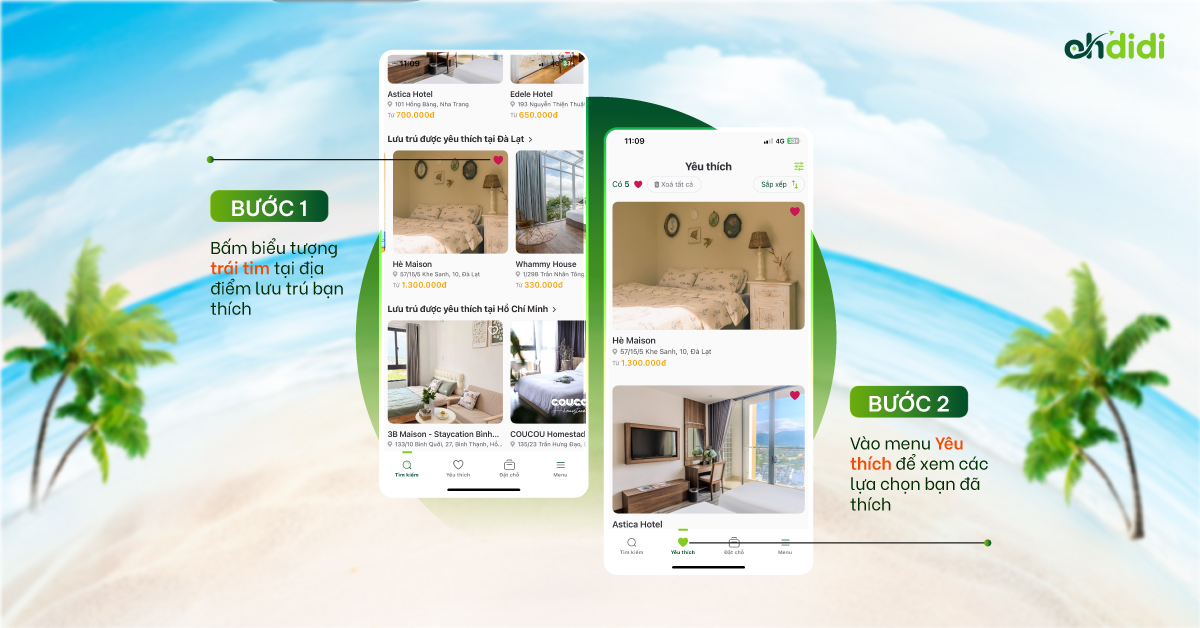 Trong thời đại bận rộn, việc lên kế hoạch du lịch cần sự gọn gàng và tiết kiệm thời gian. Với tính năng “Yêu thích” trên app Ohdidi, bạn sẽ không còn cảnh cuống cuồng tìm link homestay đã xem, cũng không còn bỏ lỡ căn nhà mơ ước chỉ vì quên tên.