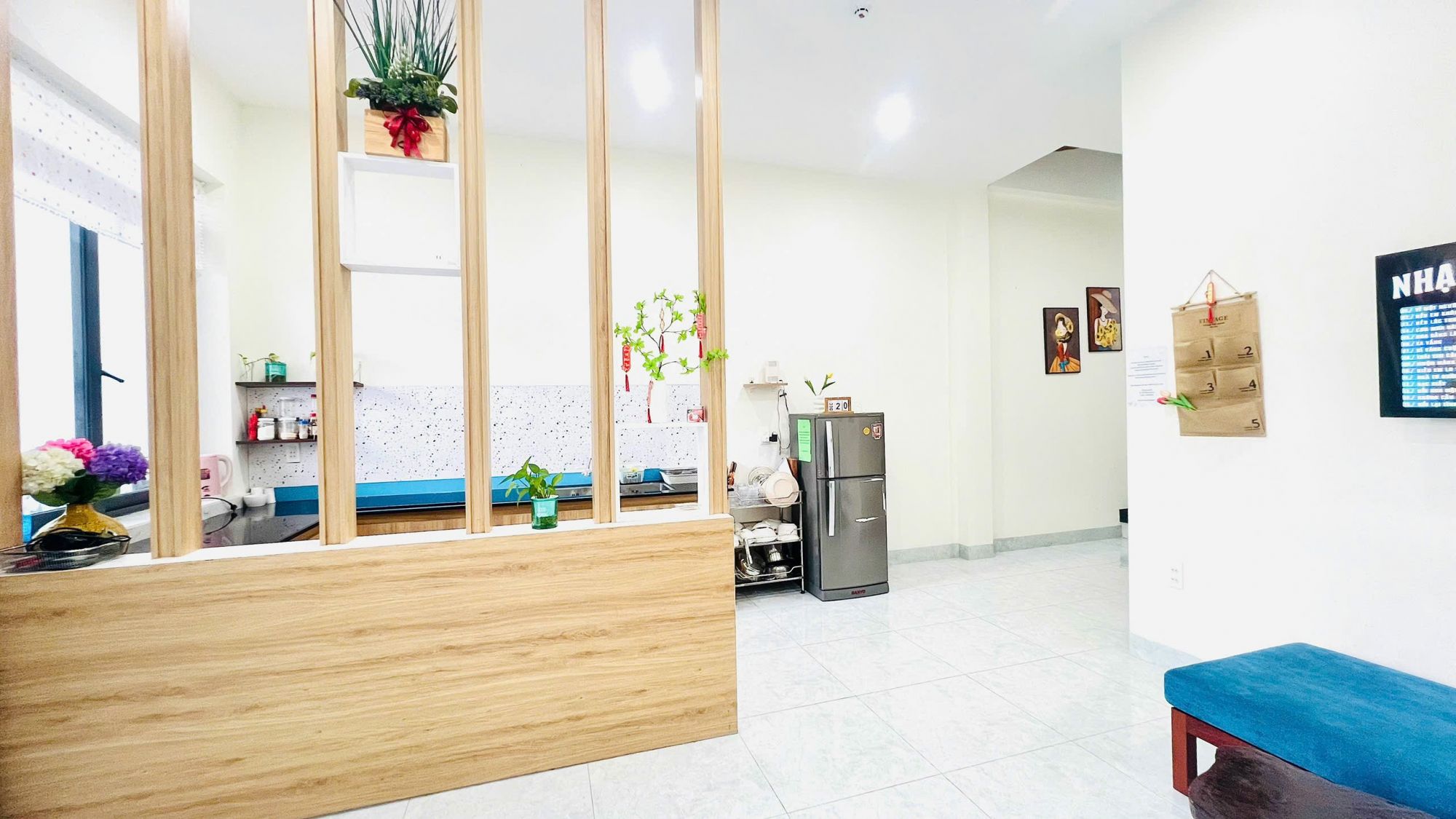 Phòng khách là trái tim của homestay, rộng rãi với sofa êm ái, khu vực bếp đầy đủ dụng cụ (bếp từ, lò vi sóng, tủ lạnh, nồi chảo) và bàn ăn lớn cho bữa tiệc tự nấu. Đây là nơi hoàn hảo để cùng nhau nấu ăn, xem phim hoặc trò chuyện đến khuya, tạo nên những kỷ niệm đáng nhớ.