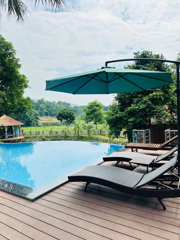 Một điểm cộng đặc biệt là bữa sáng giản dị nhưng trọn vẹn, du khách có thể tự chuẩn bị với mỳ tôm, trứng gà và rau sạch hái trực tiếp từ vườn. Không gian bếp được trang bị đầy đủ từ tủ lạnh, lò vi sóng, xoong nồi, bát đũa đến gia vị cơ bản, sẵn sàng cho những bữa tiệc BBQ ngoài trời. Ngoài ra, khách còn được tặng rau sạch và trái cây theo mùa như xoài, ổi, mít, đu đủ, vải, hồng bì…