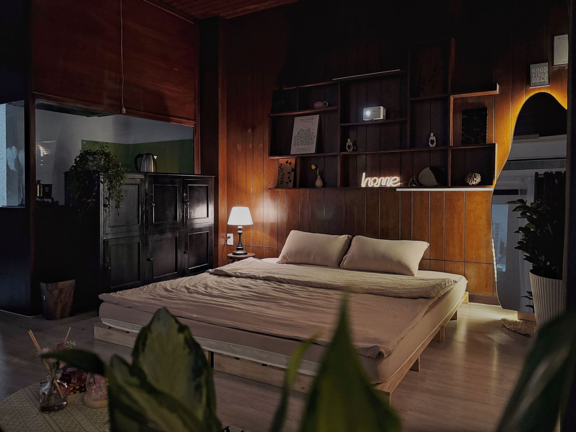 Không gian phòng ấm áp với ánh sáng vàng, giường lớn cô ái và sofa mềm thương mại càng tăng thêm cảm giác gần gũi, riêng tư – hoàn hảo cho một buổi tối “Netflix and chill” đúng nghĩa.