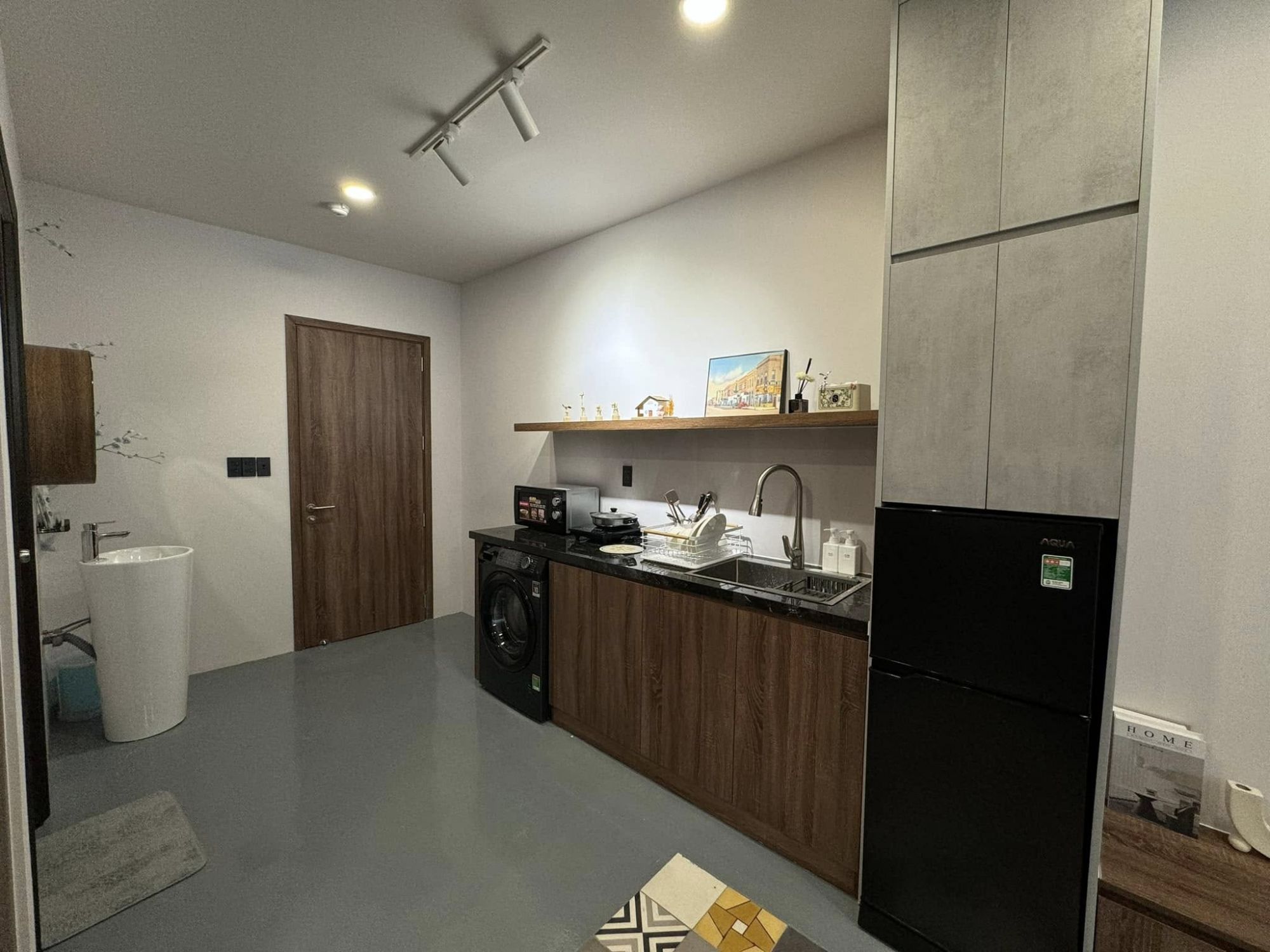 Không gian bếp nhỏ gọn nhưng đầy đủ công năng, phù hợp cho những bữa ăn nhẹ hoặc những ngày muốn tự nấu một món đơn giản. Xe máy có thể để trong nhà, tạo cảm giác an tâm và thuận tiện cho ai cần di chuyển thường xuyên trong thành phố. Đây là một điểm cộng lớn, đặc biệt với những hành trình chủ động và linh hoạt.