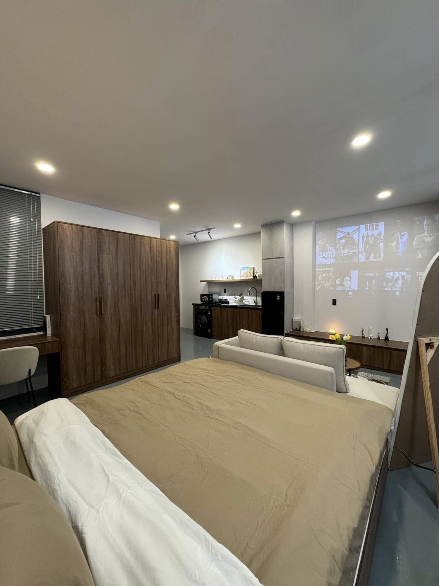 Phòng được trang bị máy chiếu xem Netflix – một điểm nhấn thú vị, tạo nên những buổi tối thư giãn không cần phải ra ngoài. Điều hòa hoạt động ổn định, nước nóng đảm bảo, giúp quá trình nghỉ ngơi trở nên trọn vẹn. Từ chăn ga đến cách sắp xếp phòng đều hướng đến sự ngăn nắp và thoáng đãng, mang đến cảm giác thoải mái khi bước vào.