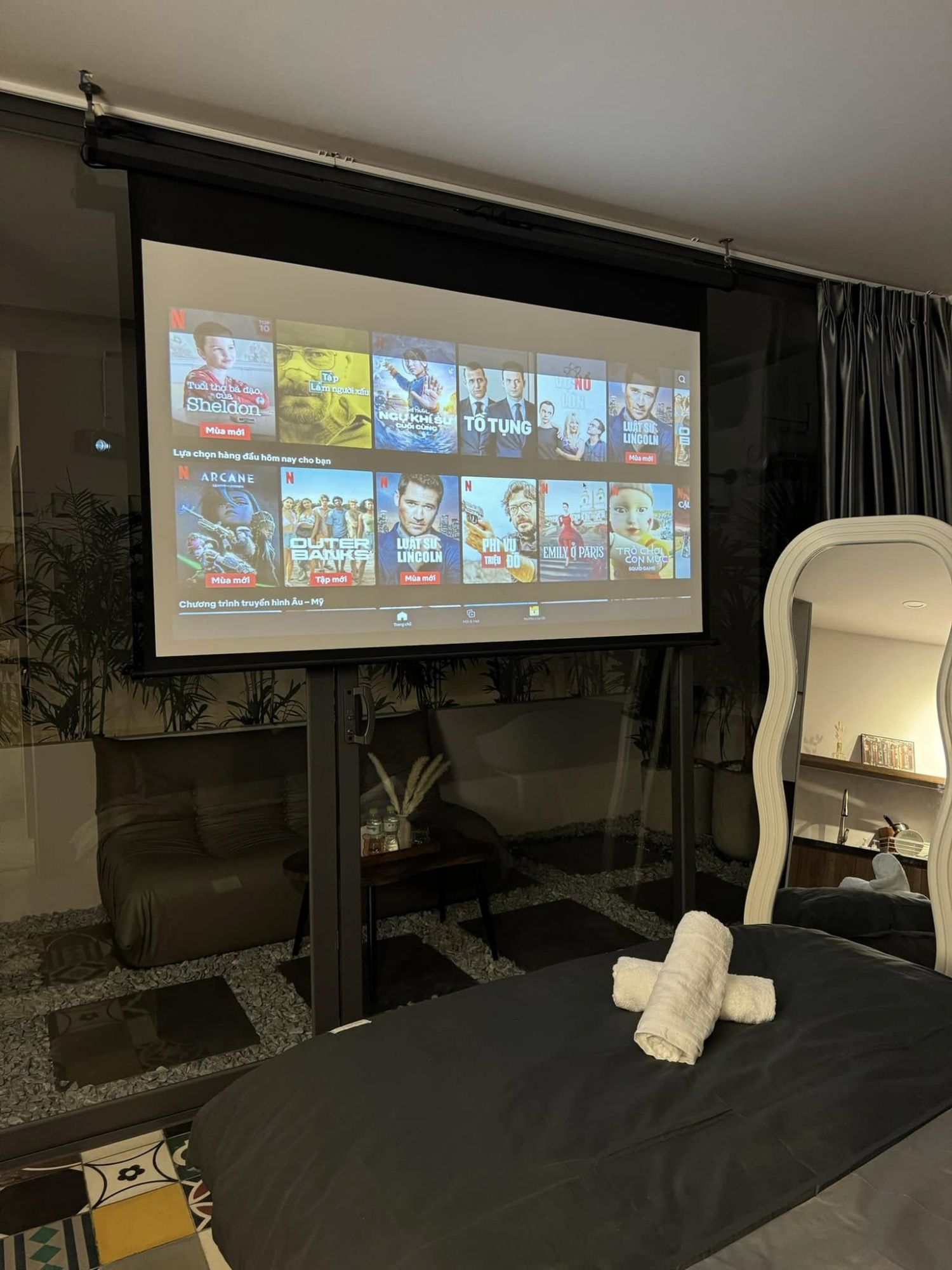 Phòng được trang bị máy chiếu xem Netflix – một điểm nhấn thú vị, tạo nên những buổi tối thư giãn không cần phải ra ngoài. Điều hòa hoạt động ổn định, nước nóng đảm bảo, giúp quá trình nghỉ ngơi trở nên trọn vẹn. Từ chăn ga đến cách sắp xếp phòng đều hướng đến sự ngăn nắp và thoáng đãng, mang đến cảm giác thoải mái khi bước vào.