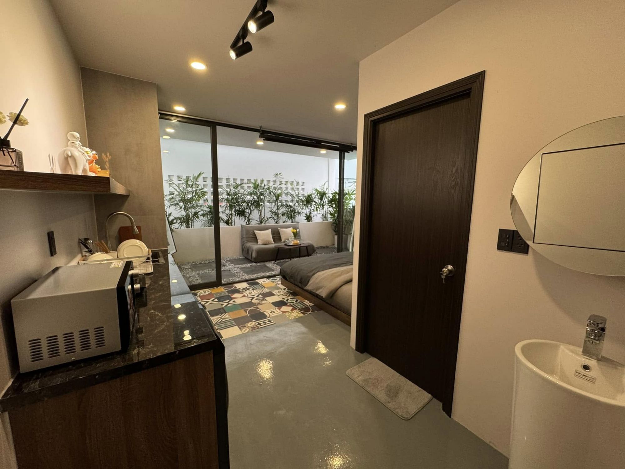 Không gian bếp nhỏ gọn nhưng đầy đủ công năng, phù hợp cho những bữa ăn nhẹ hoặc những ngày muốn tự nấu một món đơn giản. Xe máy có thể để trong nhà, tạo cảm giác an tâm và thuận tiện cho ai cần di chuyển thường xuyên trong thành phố. Đây là một điểm cộng lớn, đặc biệt với những hành trình chủ động và linh hoạt.