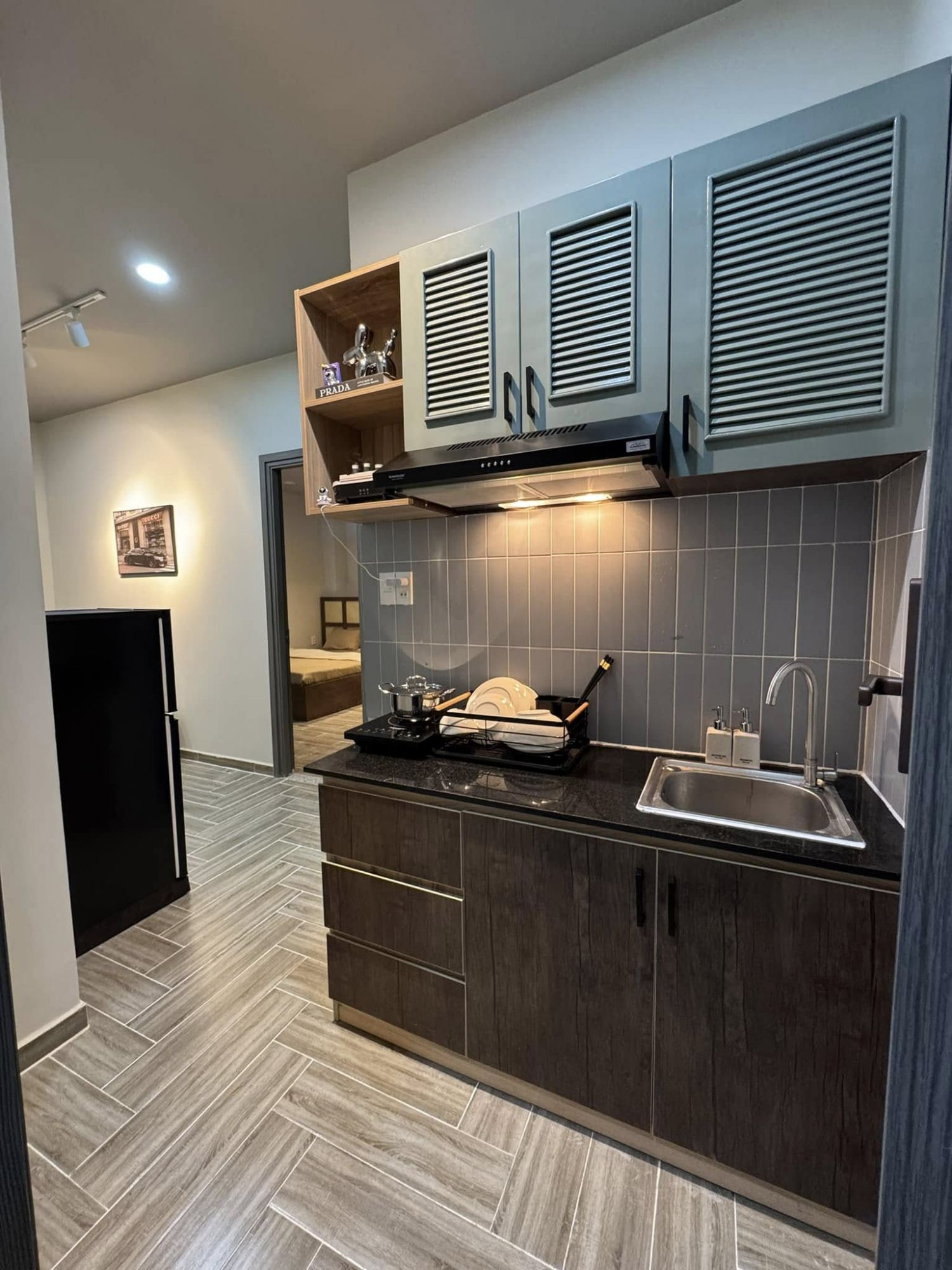 Không gian bếp nhỏ gọn nhưng đầy đủ công năng, phù hợp cho những bữa ăn nhẹ hoặc những ngày muốn tự nấu một món đơn giản. Xe máy có thể để trong nhà, tạo cảm giác an tâm và thuận tiện cho ai cần di chuyển thường xuyên trong thành phố. Đây là một điểm cộng lớn, đặc biệt với những hành trình chủ động và linh hoạt.