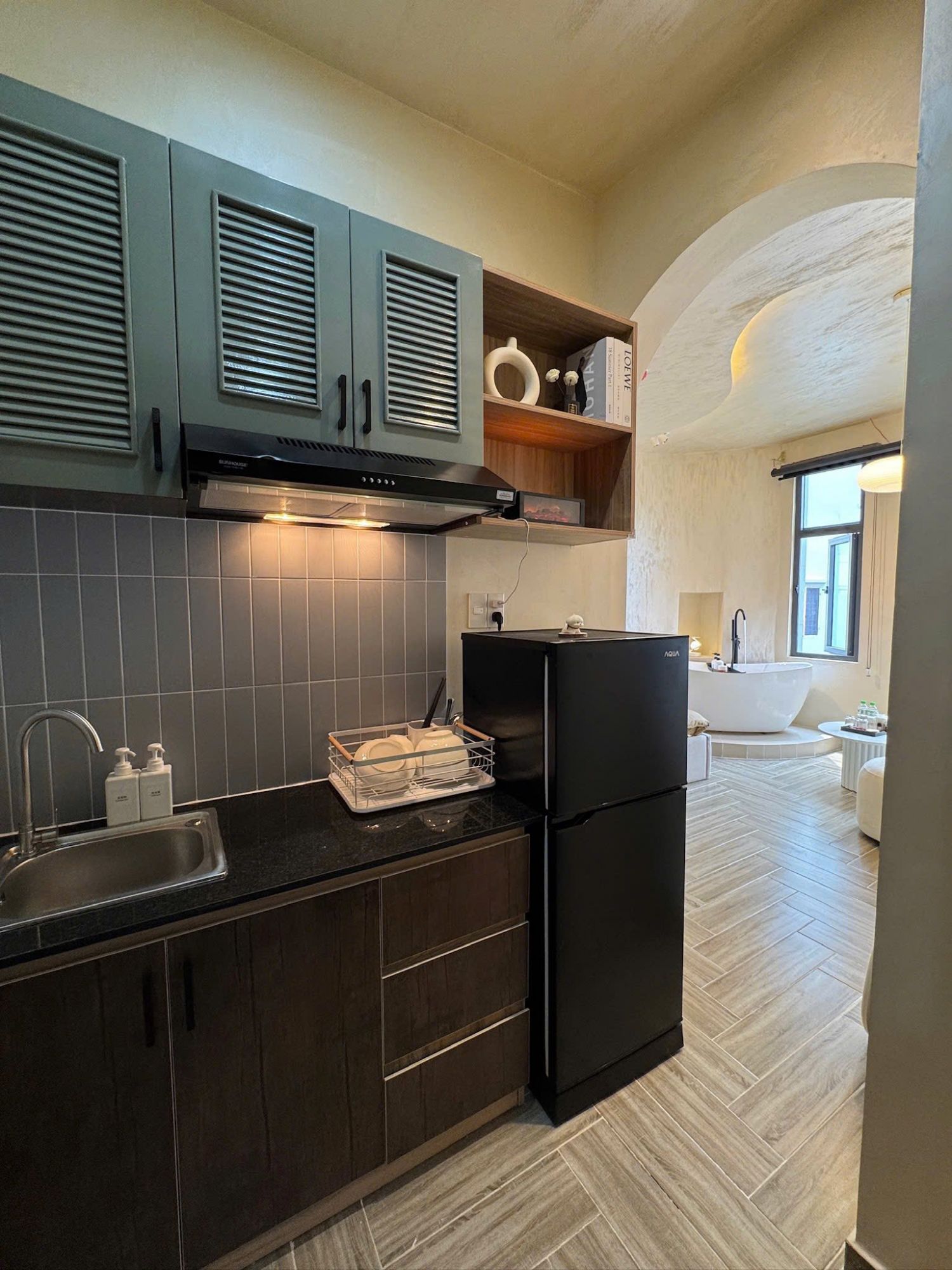 Từng chi tiết nhỏ được chuẩn bị sẵn giúp quá trình nghỉ lại trở nên tinh gọn và dễ chịu. Nước suối trong phòng và đầy đủ vật dụng sinh hoạt giúp giảm bớt những chuẩn bị rườm rà. Bếp có sẵn chén bát, nồi, dụng cụ cần thiết cho các bữa ăn nhanh, tạo sự linh hoạt trong sinh hoạt hằng ngày.