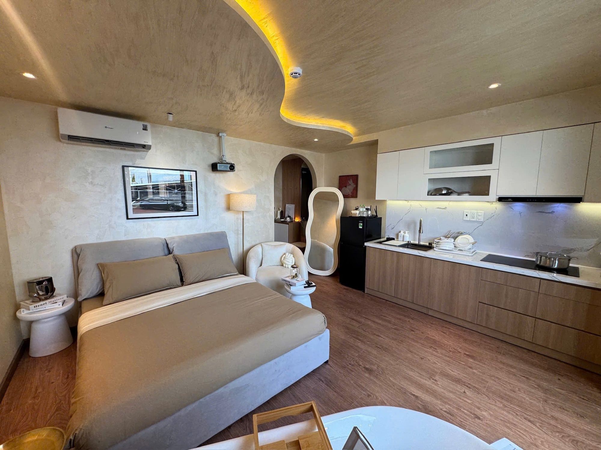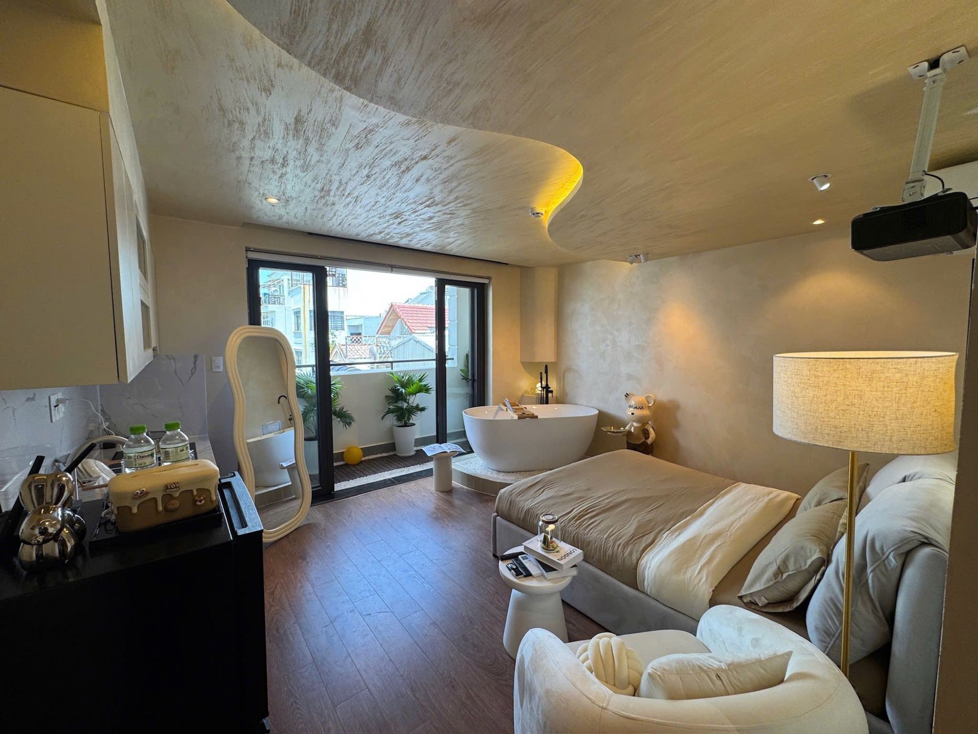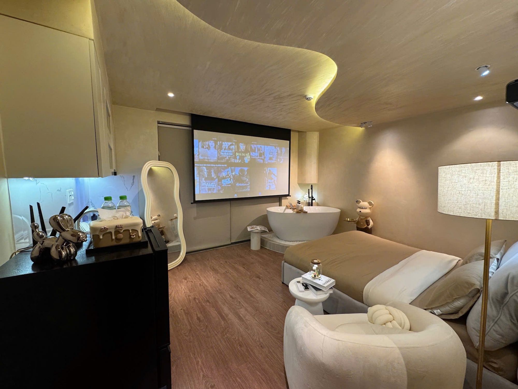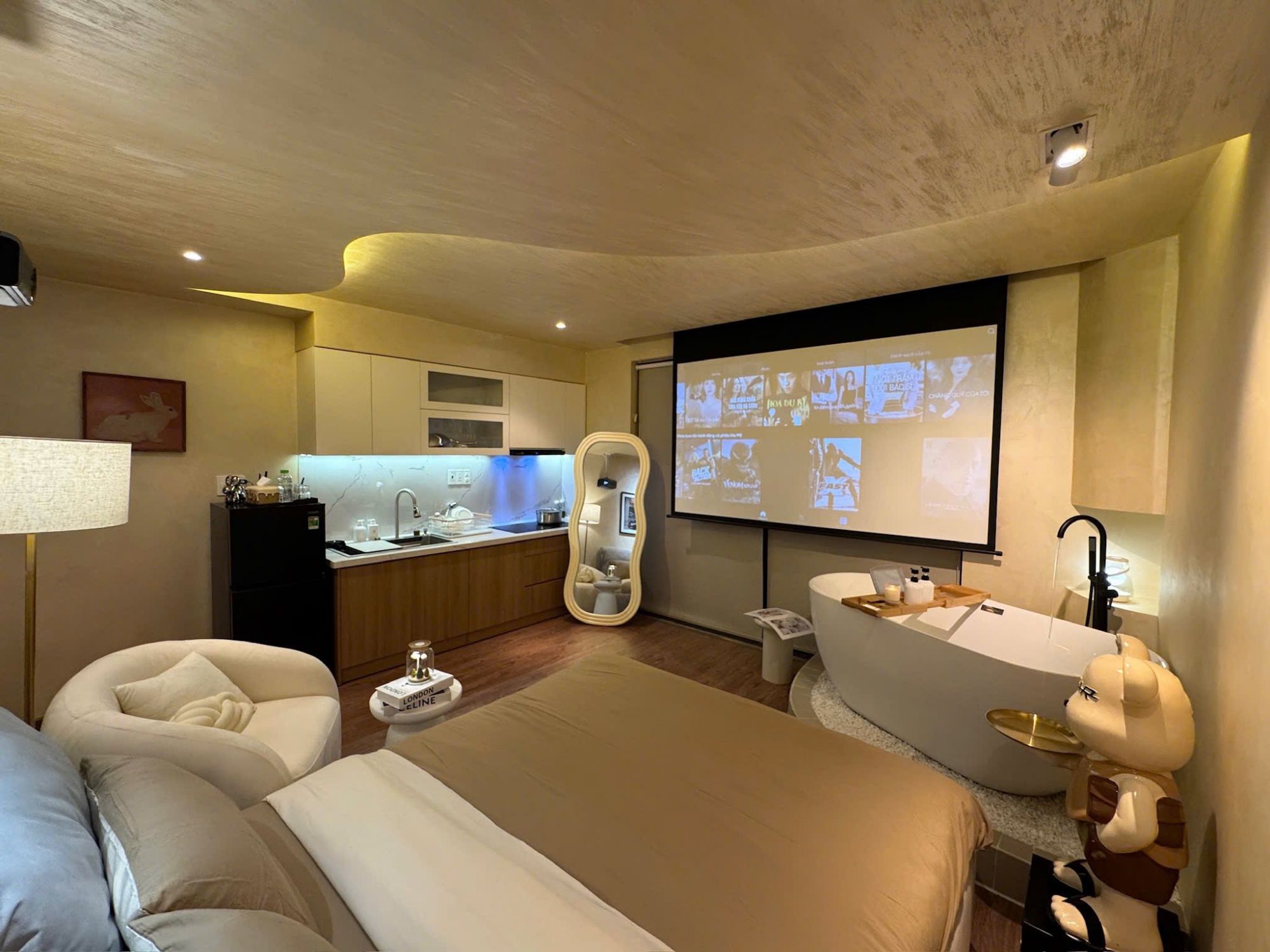 Phòng nghỉ được thiết kế để mang đến sự tiện dụng và cảm giác thư giãn trọn vẹn. Bồn tắm trở thành điểm nhấn đáng nhớ – nơi người ở có thể thả mình vào làn nước ấm sau một ngày dài di chuyển. Máy chiếu hỗ trợ xem Netflix tạo ra những buổi tối thật sự thư giãn, khiến trải nghiệm lưu trú có thêm phần ấm cúng và gần gũi. Không gian yên tĩnh cùng hệ thống điều hòa hoạt động ổn định mang lại cảm giác dễ chịu bất kể thời điểm trong ngày.