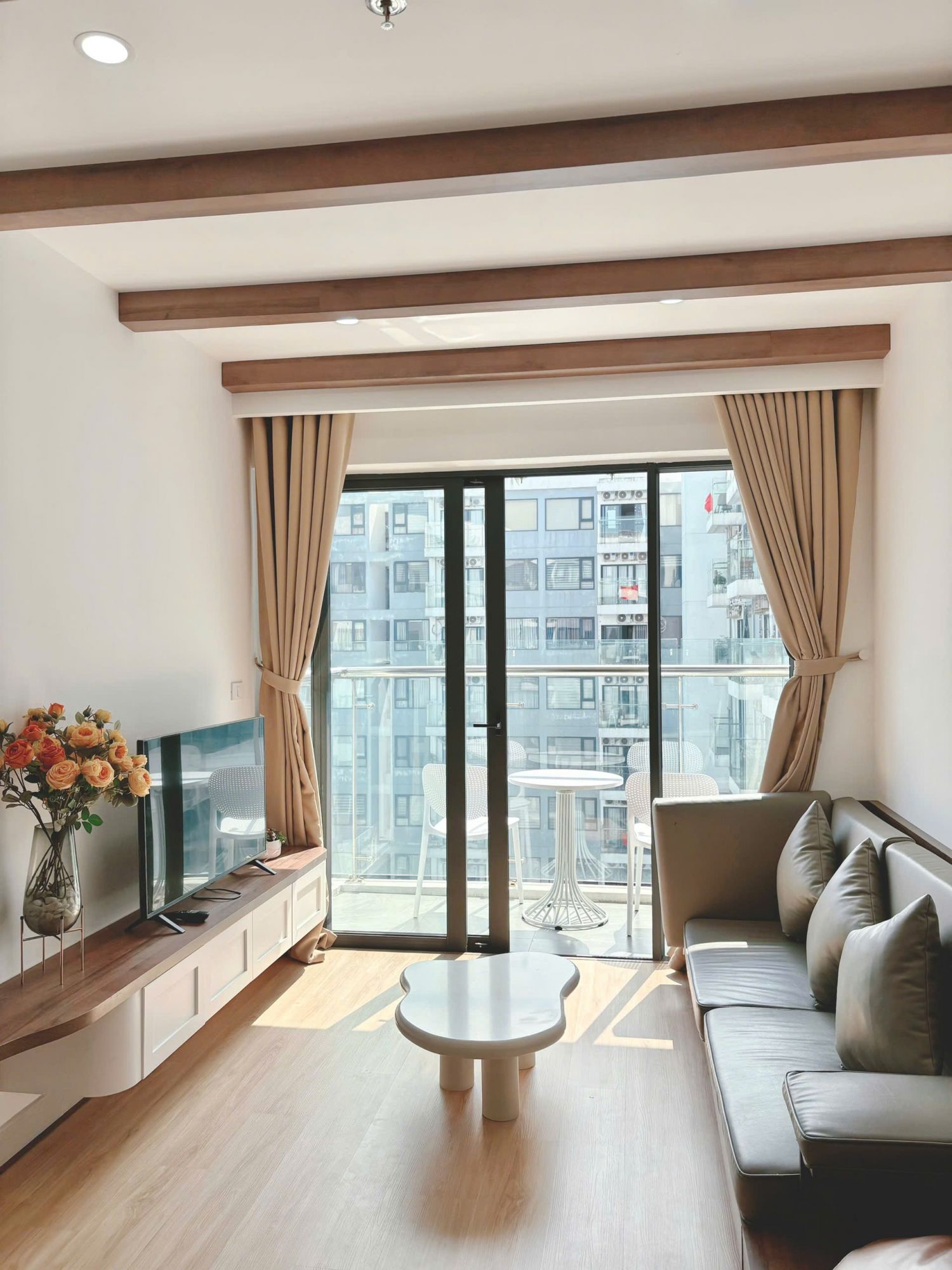 Căn hộ được trang bị đầy đủ các thiết bị như điều hòa, máy nước nóng, TV, wifi tốc độ cao, cùng bộ chăn ga gối nệm theo tiêu chuẩn khách sạn 5 sao. View từ căn hộ mở ra không gian thành phố yên bình và thoáng đãng, đặc biệt thích hợp cho những buổi sáng thư giãn bên tách cà phê.