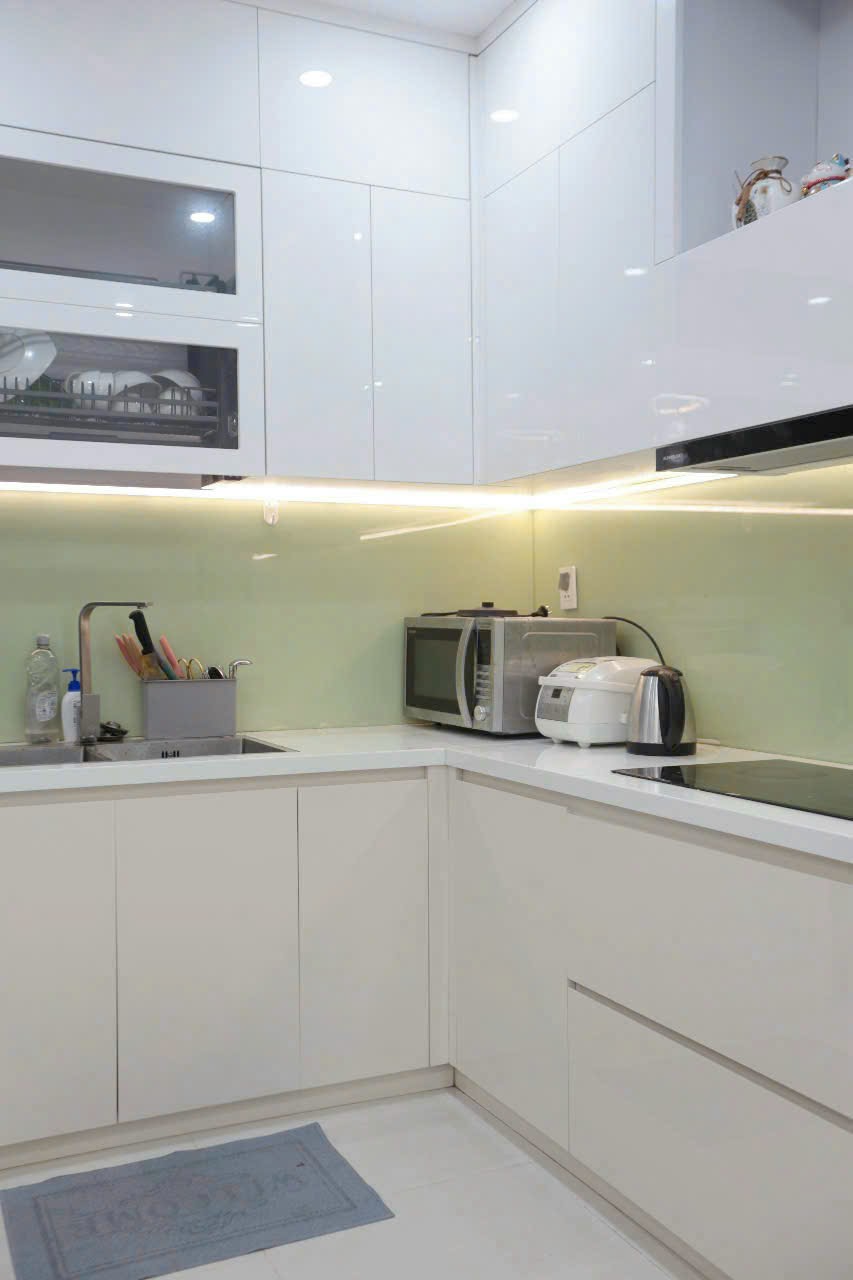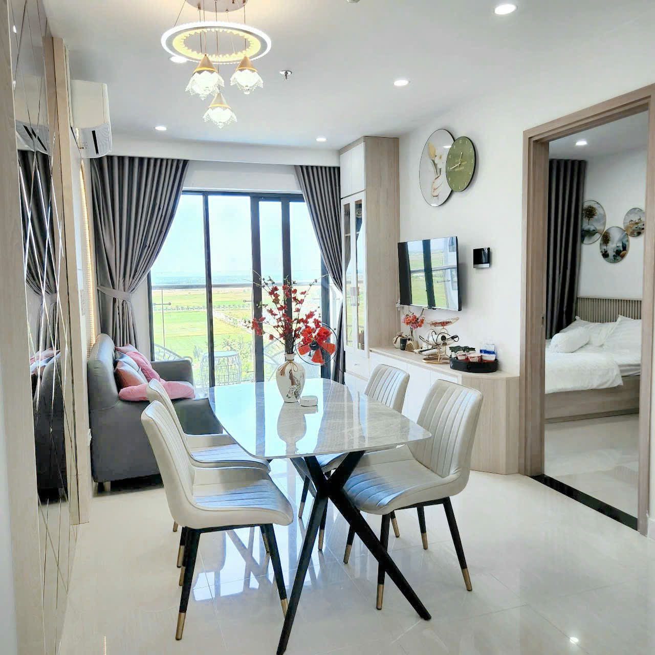 Căn hộ được trang bị đầy đủ các thiết bị như điều hòa, máy nước nóng, TV, wifi tốc độ cao, cùng bộ chăn ga gối nệm theo tiêu chuẩn khách sạn 5 sao. View từ căn hộ mở ra không gian thành phố yên bình và thoáng đãng, đặc biệt thích hợp cho những buổi sáng thư giãn bên tách cà phê.