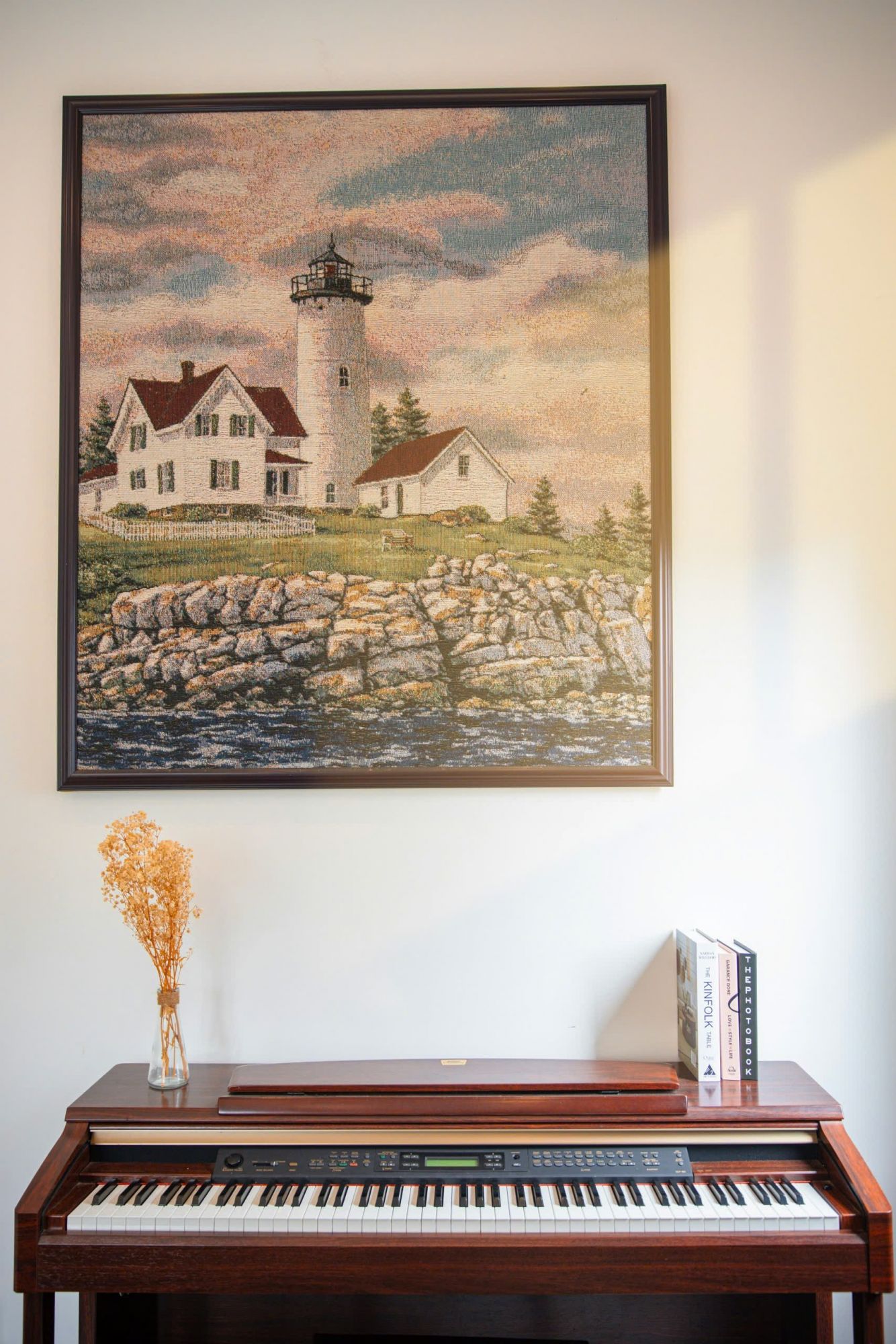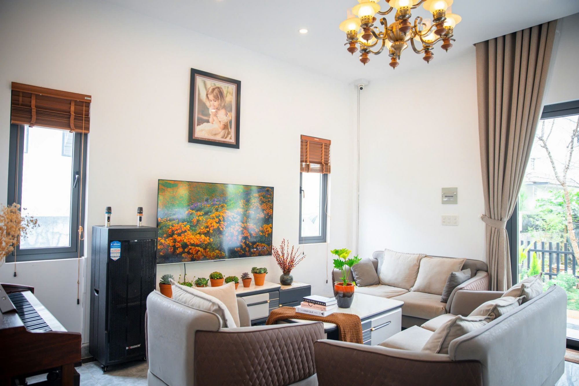- Phòng khách giải trí: Trang bị dàn loa karaoke sống động, đàn piano, đàn guitar và TV 75 inch kết nối Youtube/Netflix.