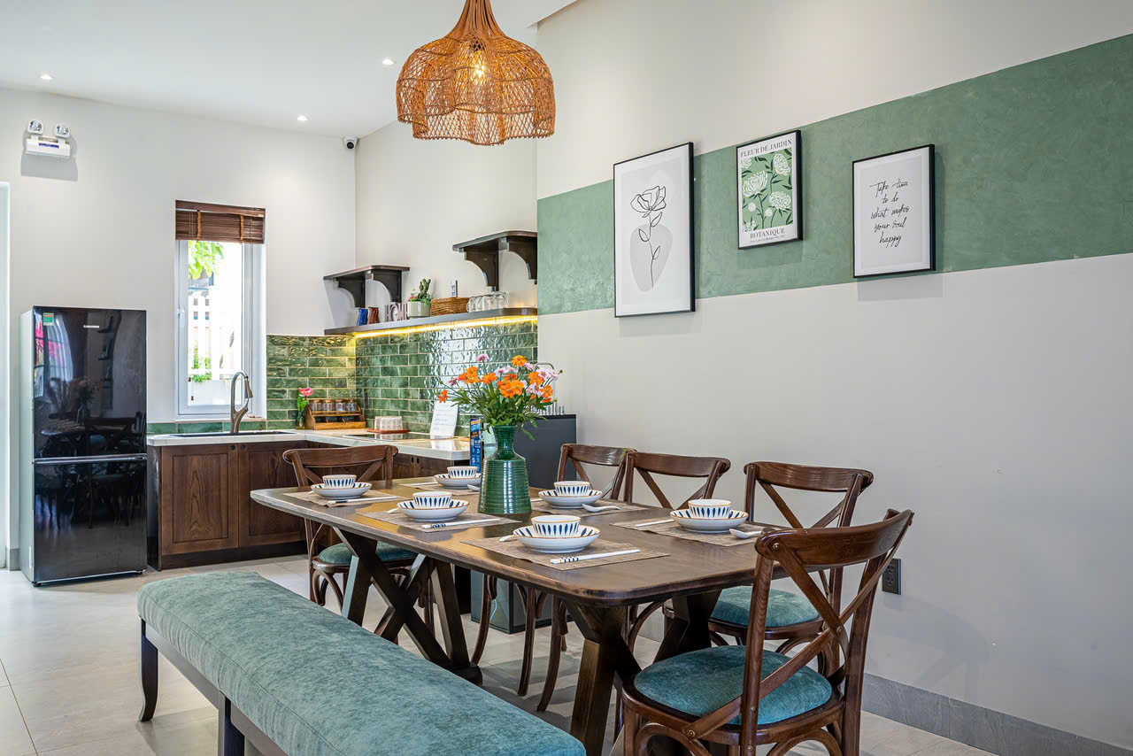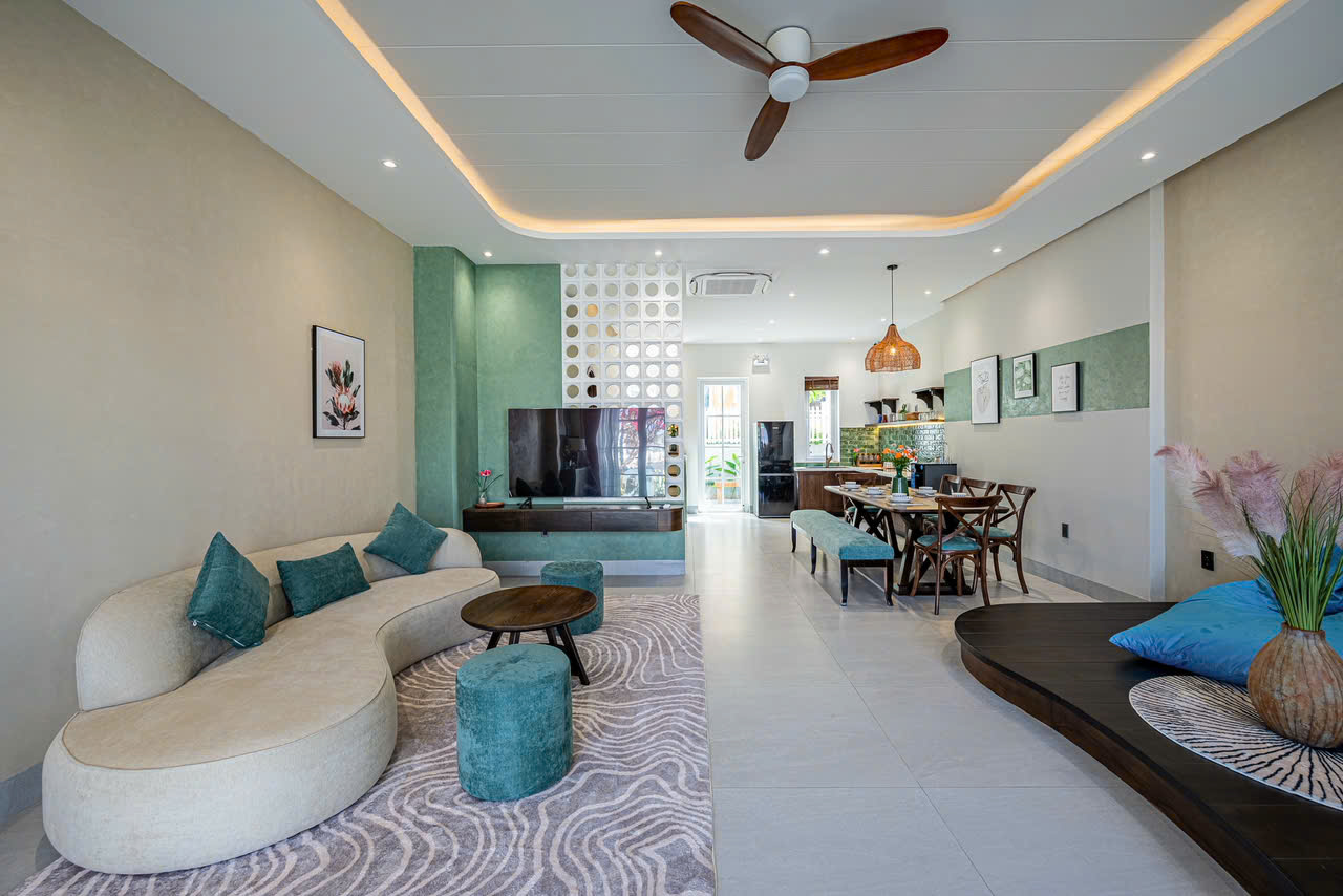 Khu vực phòng khách và bếp được thiết kế thoáng đãng, đầy đủ đồ dùng sinh hoạt, trang bị máy lạnh cho toàn bộ căn nhà, mang đến cảm giác dễ chịu suốt thời gian lưu trú. Không gian ngoài trời có bàn ghế ăn và khu bếp nướng BBQ, rất phù hợp cho những buổi quây quần, tổ chức bữa ăn ấm cúng.