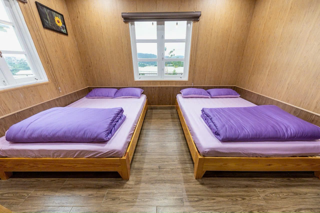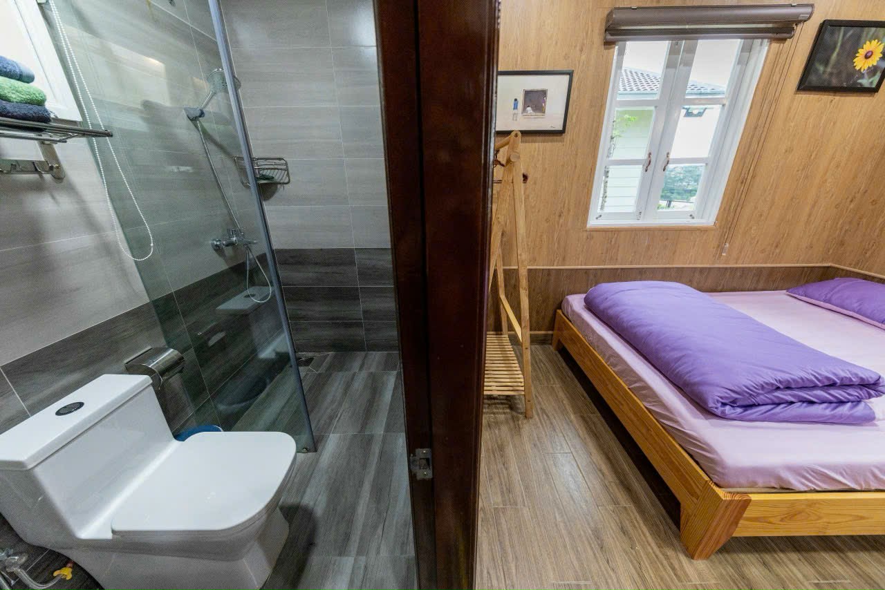Căn gỗ chính được thiết kế gọn gàng nhưng đầy đủ tiện nghi, mang đậm phong cách vintage ấm áp. Bên trong có 2 phòng đôi, mỗi phòng đặt hai giường lớn 1m6 với bộ chăn ga tươm tất, tạo cảm giác thoải mái ngay khi bước vào. Hai toilet khép kín sạch sẽ giúp việc sinh hoạt thuận tiện mà vẫn đảm bảo riêng tư cho từng nhóm nhỏ. Khu bếp riêng có sẵn gia vị cơ bản và dụng cụ nấu nướng đầy đủ, sẵn sàng cho những bữa cơm sum vầy giữa tiết trời se lạnh. Không gian này phù hợp cho nhóm từ 6 đến 8 khách, dù là gia đình hay nhóm bạn thân đều dễ dàng tìm được sự gắn kết tự nhiên.