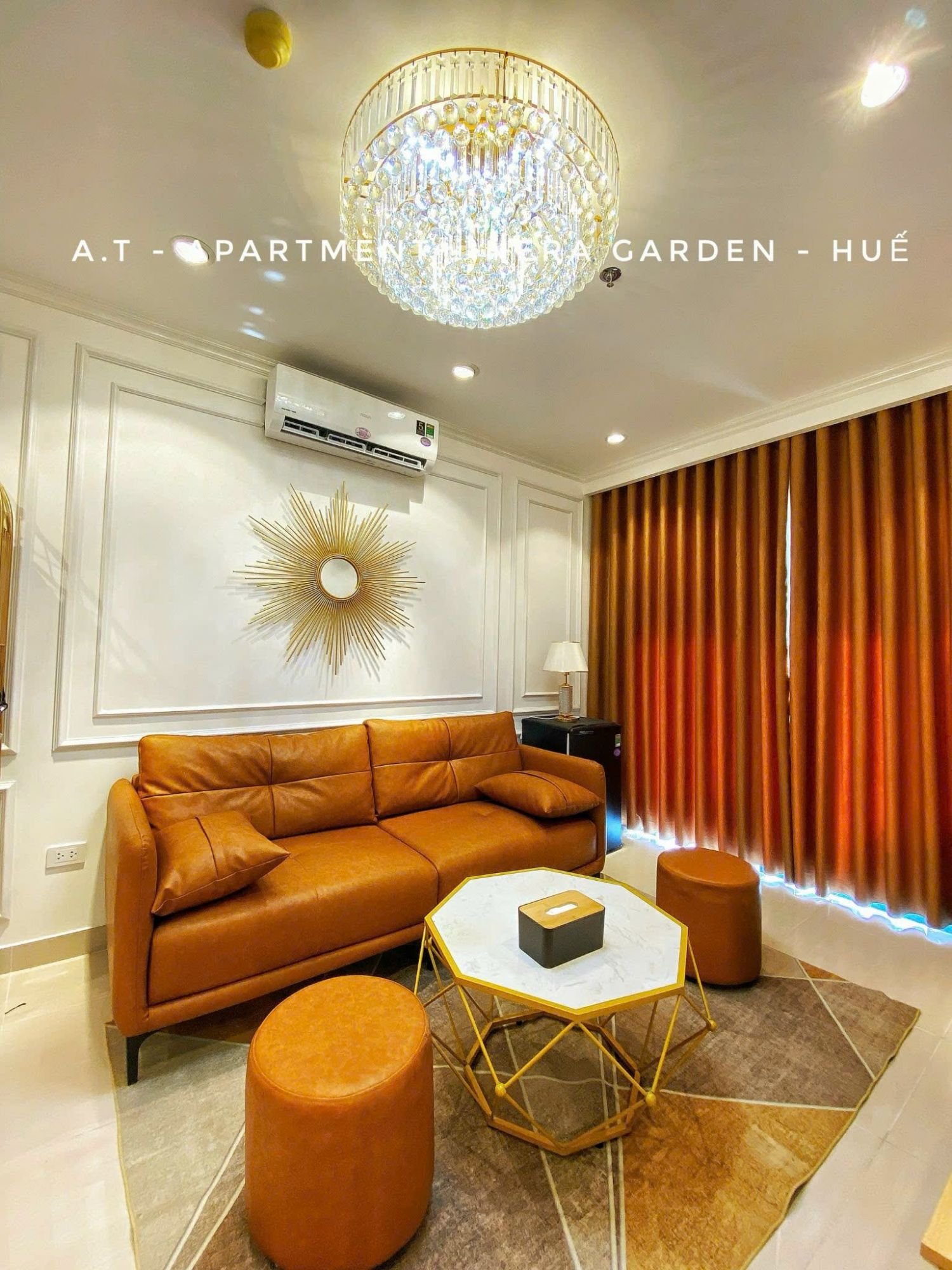 Khu vực phòng khách được bố trí rộng rãi, là nơi lý tưởng để cả nhóm cùng trò chuyện, xem phim hay thư giãn. Căn hộ được trang bị hai tivi, một đặt tại phòng khách và một trong phòng ngủ, đáp ứng nhu cầu giải trí linh hoạt cho nhiều thành viên. Không gian sinh hoạt chung được kết nối hài hòa với khu bếp, tạo sự thuận tiện trong quá trình sử dụng.