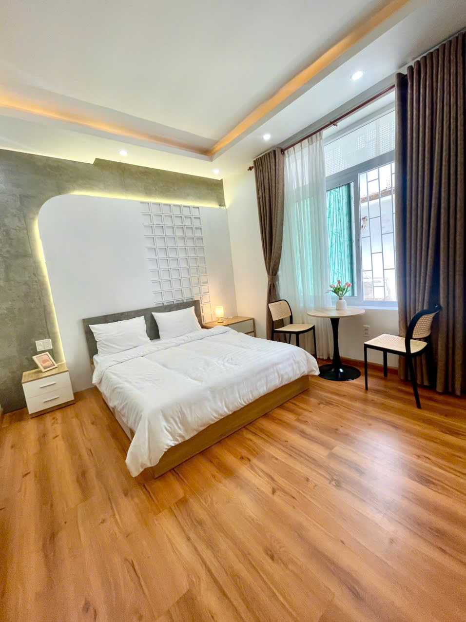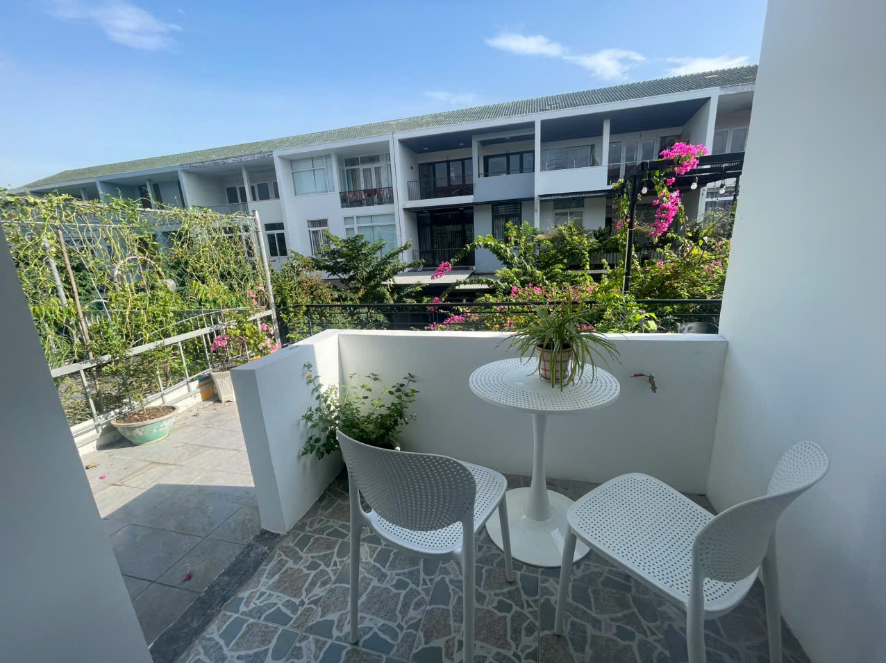 Tổng thể căn nhà được thiết kế theo hướng thân thiện, chú trọng cảm giác sinh hoạt gia đình. Các khu vực được bố trí hợp lý, tạo sự kết nối liền mạch giữa phòng khách, bếp và không gian nghỉ ngơi. Ánh sáng tự nhiên được tận dụng khéo léo, kết hợp cùng ban công rộng rãi nhiều hoa, mang lại cảm giác thoáng đãng và dễ chịu trong suốt thời gian lưu trú.