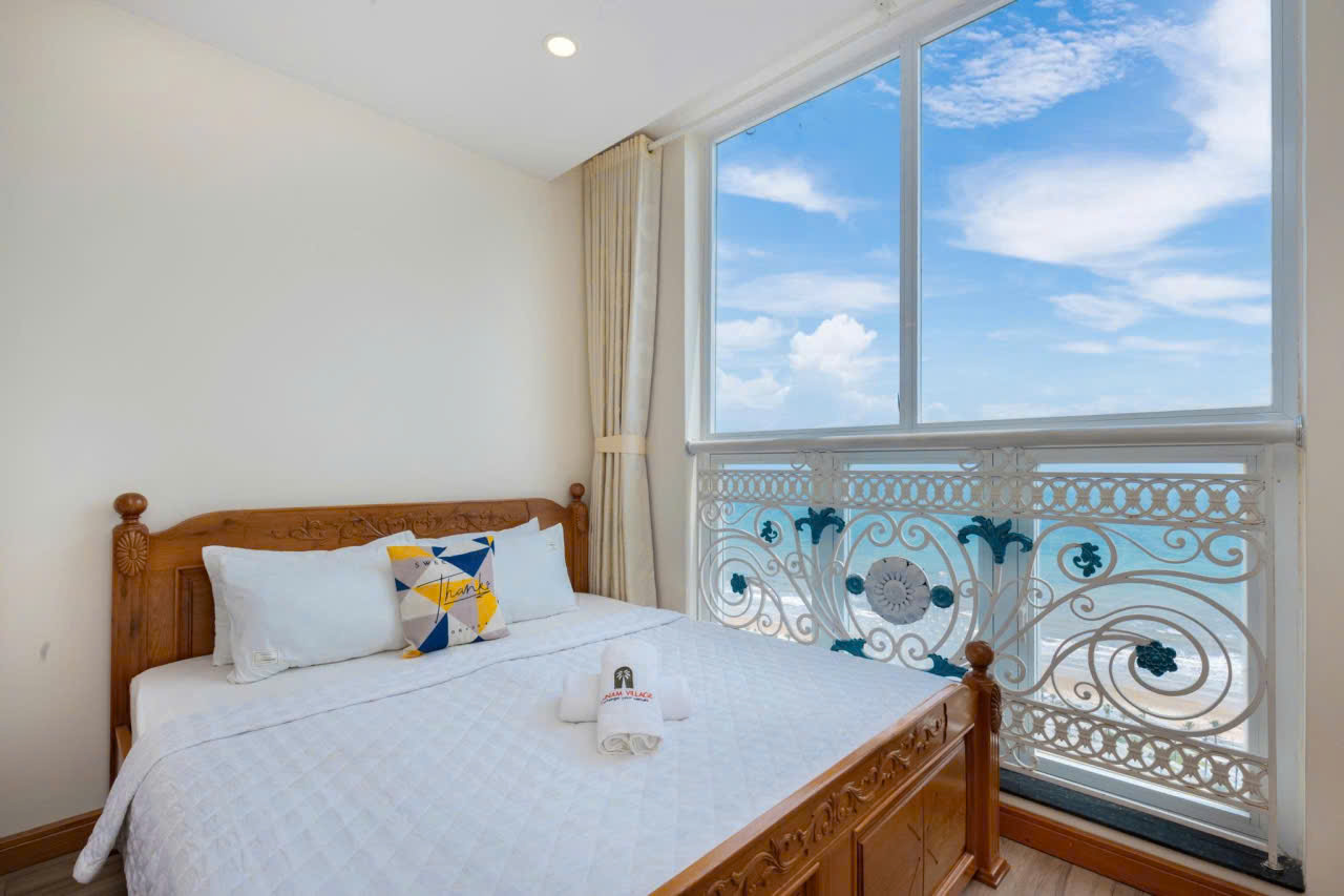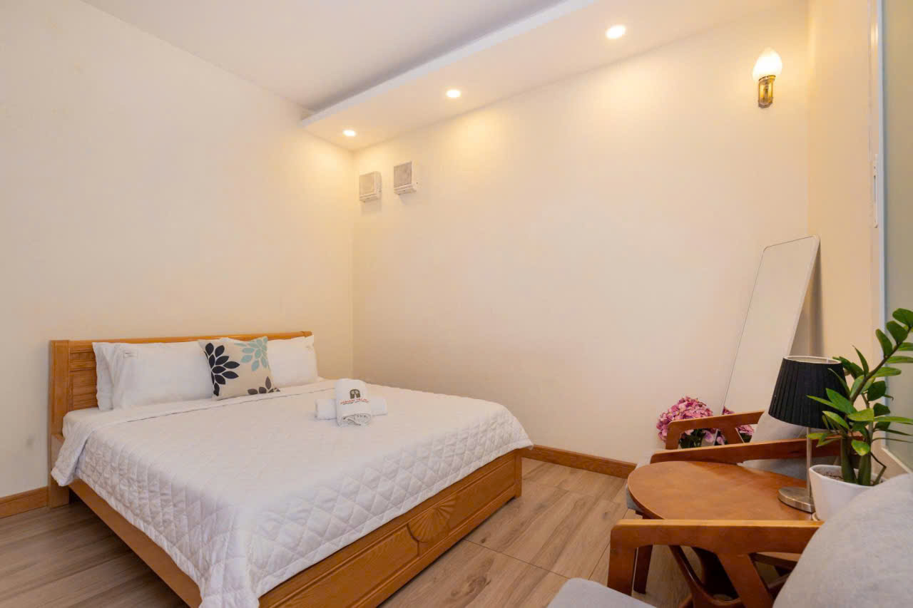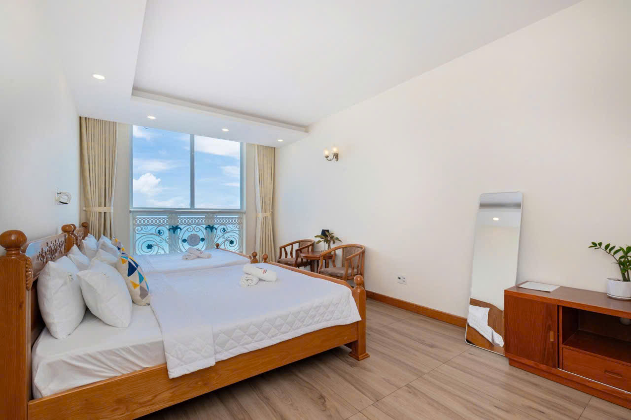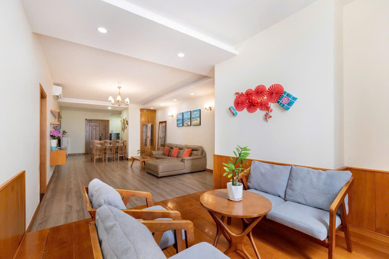 Căn hộ có diện tích 120m2, gồm một phòng khách kết hợp bếp, hai phòng ngủ, hai nhà vệ sinh và sức chứa từ 6 đến 10 người với 3 giường và nệm phụ. Nội thất hiện đại, trang bị đầy đủ đồ dùng cơ bản và tiện nghi, mang đến không gian nghỉ dưỡng thoải mái và tiện lợi cho gia đình hoặc nhóm bạn.