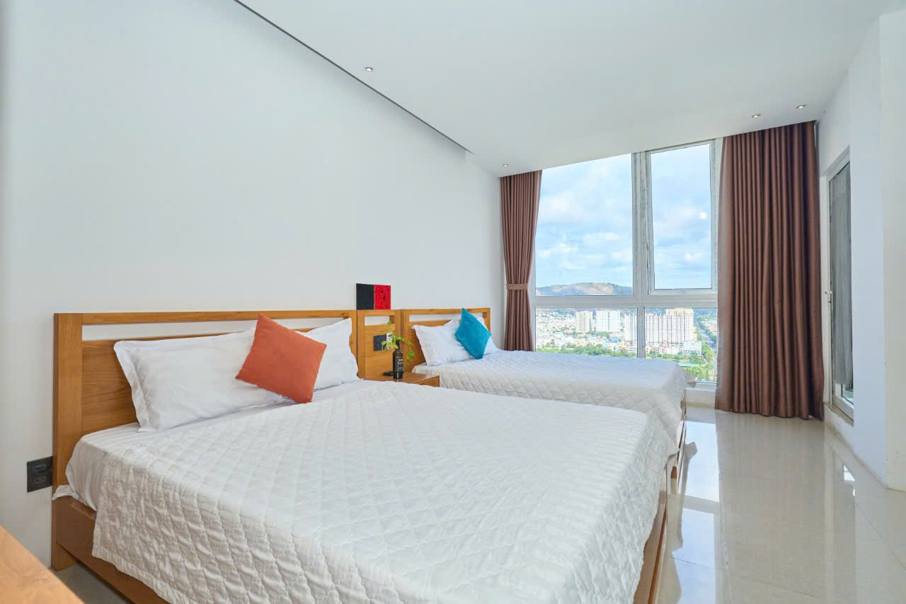Căn hộ có diện tích 135m2, gồm 1 phòng khách kết hợp bếp, 2 phòng ngủ và 2 nhà vệ sinh riêng biệt. Bố trí không gian hợp lý, phù hợp cho nhóm bạn hoặc gia đình từ 6 đến 10 người. Căn hộ có 3 giường và nệm thêm, mang lại sự tiện nghi và thoải mái cho mọi nhu cầu nghỉ ngơi. Ban công rộng, hướng ra cả phố và biển, giúp du khách dễ dàng ngắm bình minh hay hoàng hôn tuyệt đẹp của Vũng Tàu.