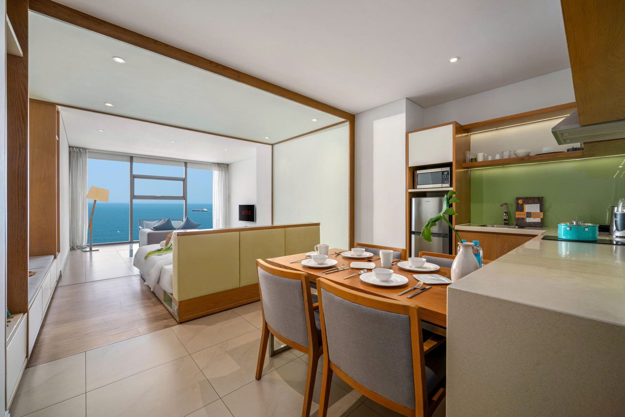 Khu vực sinh hoạt rộng rãi, có TV kết nối Netflix và cửa hướng biển.