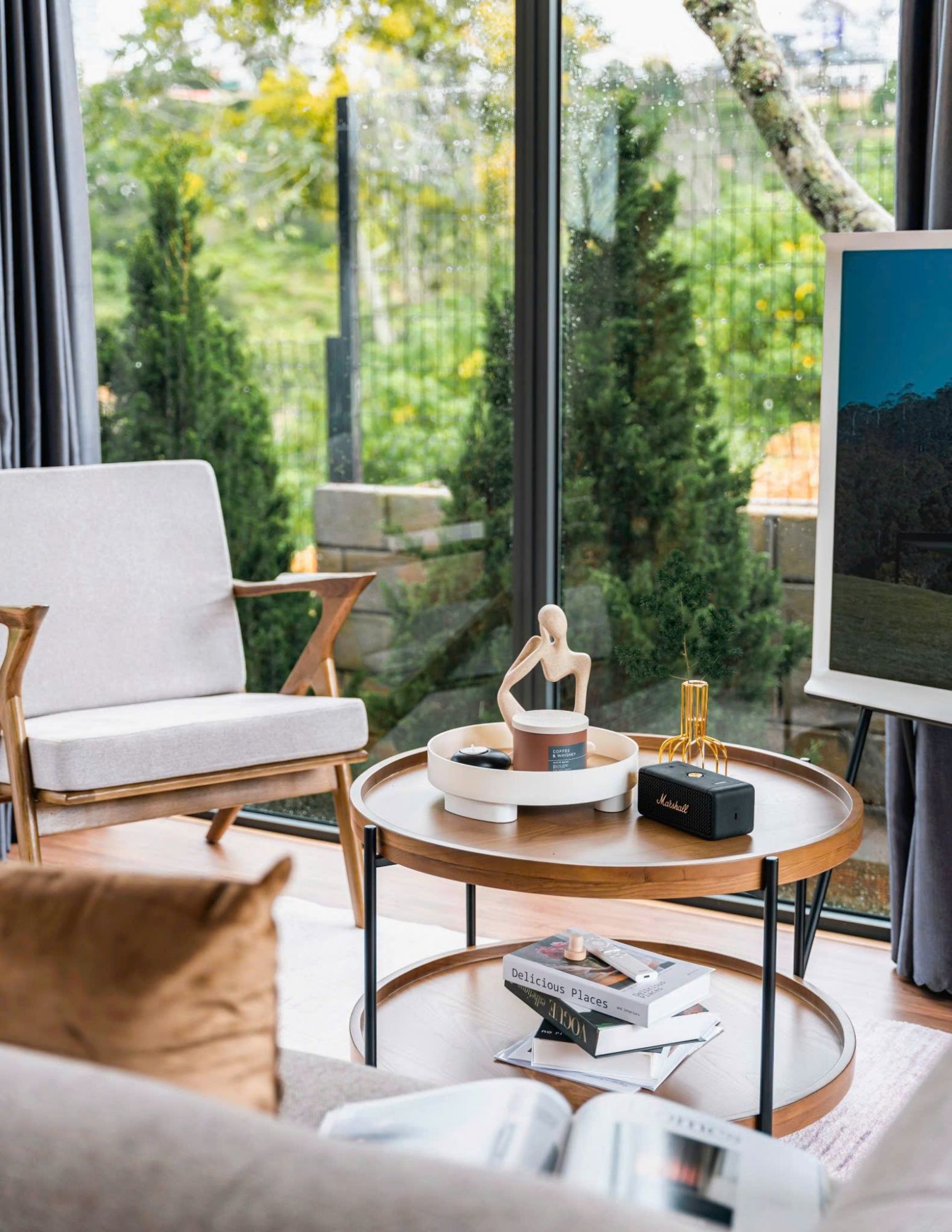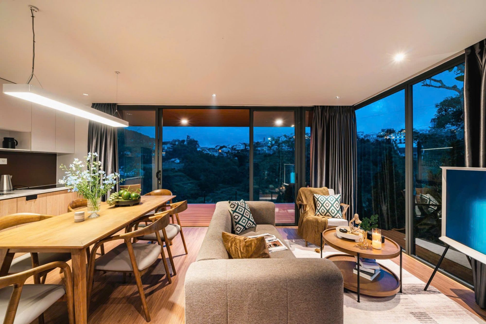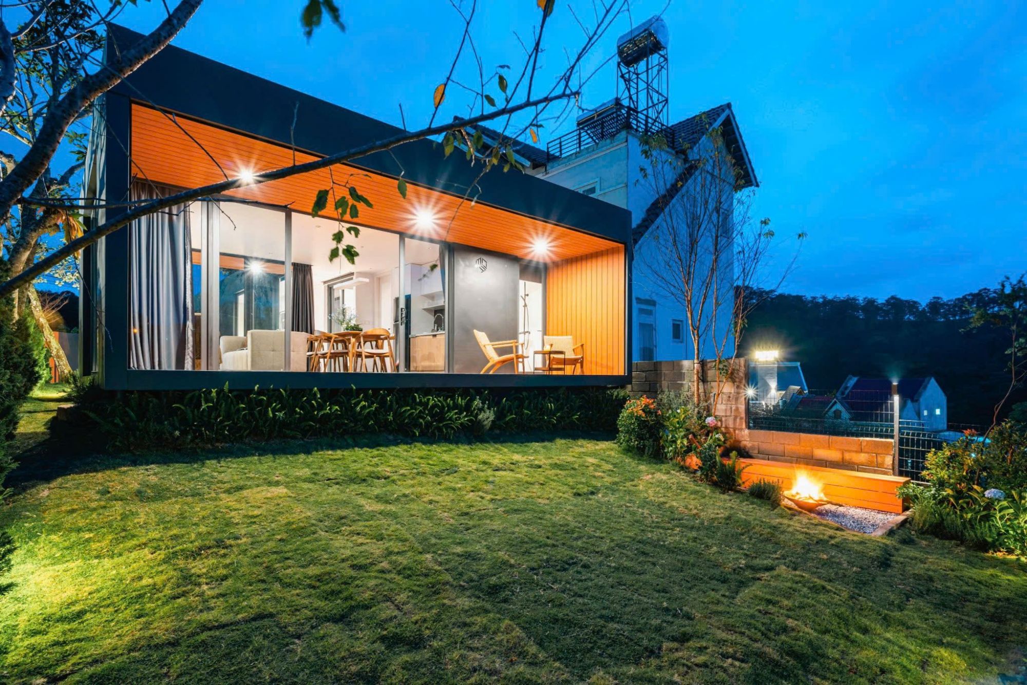 Không gian sinh hoạt chung rộng rãi với phòng khách và khu bếp có view trực diện ra thung lũng, mang đến cảm giác thư giãn và gần gũi thiên nhiên. Khu vực BBQ ngoài trời thoáng mát, có sẵn bếp và đầy đủ dụng cụ, kèm chảo lửa phù hợp cho những buổi tụ họp ấm cúng.