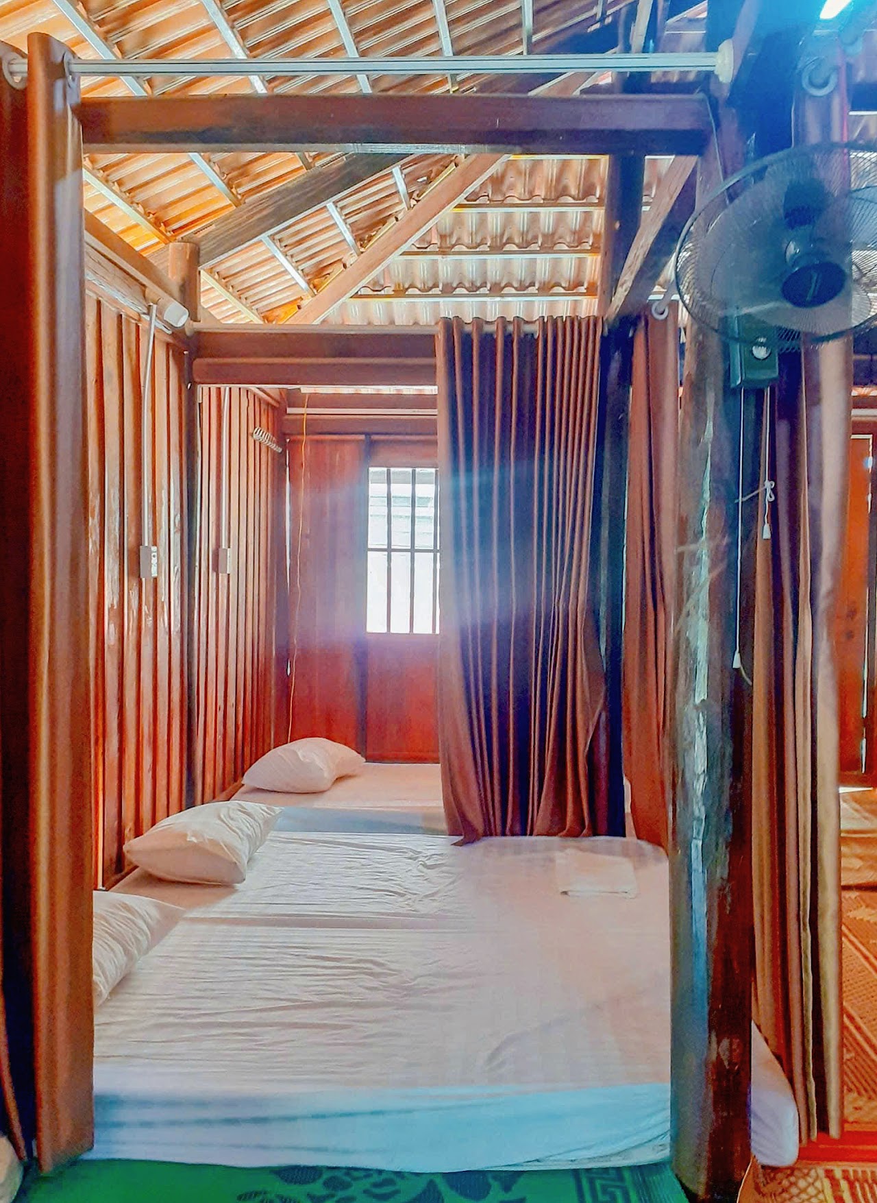 Toàn bộ hệ thống phòng tại Cốm Homestay Bản Giốc được bố trí gọn gàng trong kiến trúc nhà sàn gỗ, tách biệt hoàn toàn với sự ồn ã của phố thị. Mỗi phòng đều được trang bị đệm dày, chăn ấm, quạt mát hoặc điều hòa (tùy loại phòng), nhà vệ sinh khép kín và nước nóng lạnh đầy đủ. Dù nằm giữa rừng núi, không gian bên trong vẫn sạch sẽ, ngăn nắp và ấm cúng, đủ để khách an tâm nghỉ ngơi.