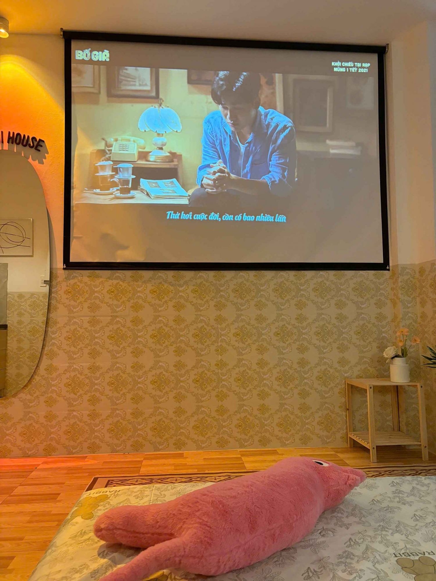 Điểm nhấn của căn phòng tại Corgi House chính là hệ thống máy chiếu phim kết hợp cùng bộ tiny PS4 – đủ để biến buổi tối trở thành một rạp chiếu mini hoặc một không gian giải trí đúng nghĩa. Thay vì phải ra ngoài tìm quán xá, chỉ cần nằm trên giường, chọn một bộ phim yêu thích hoặc cùng nhau chơi game là đã có một buổi tối trọn vẹn.