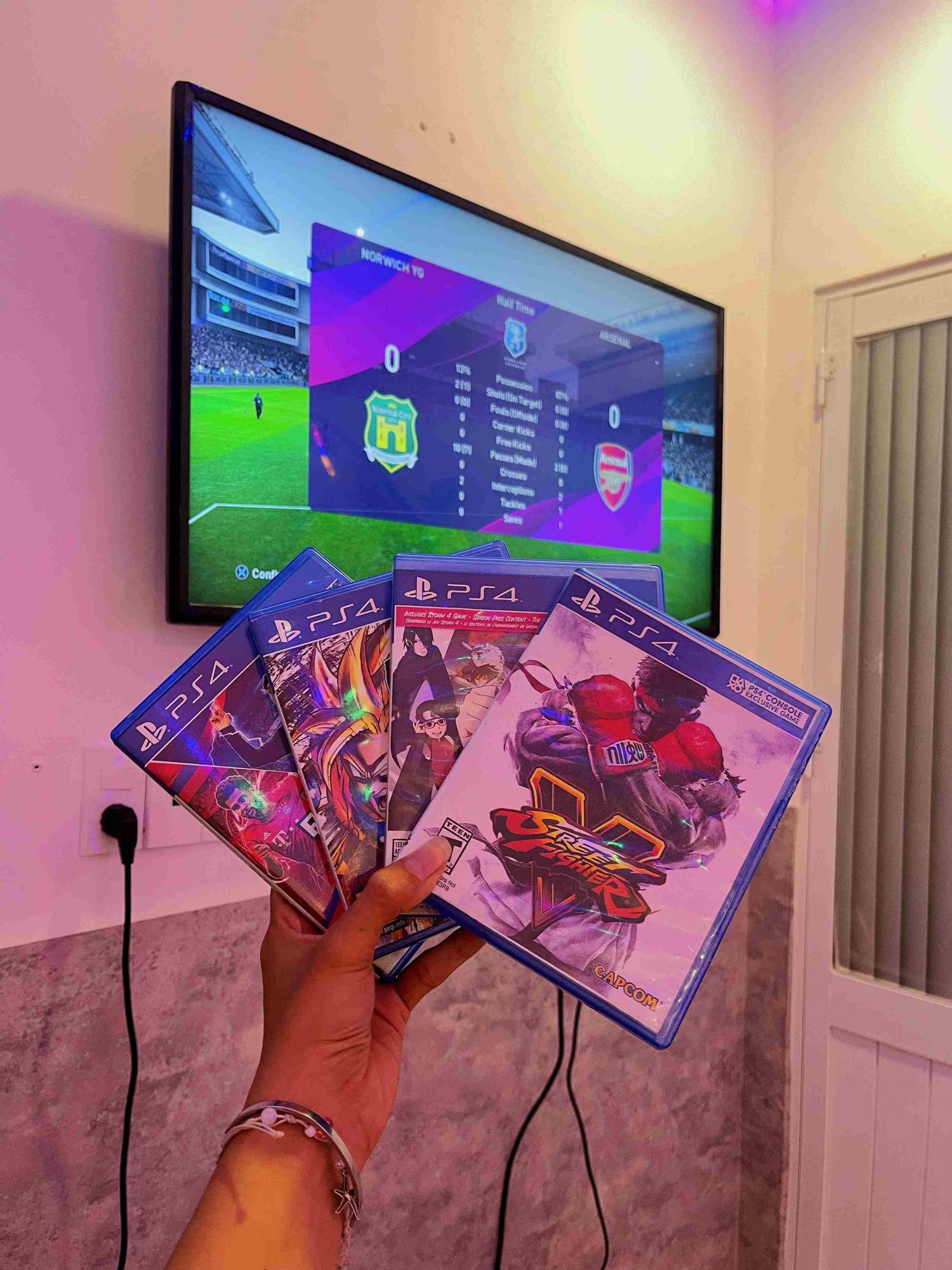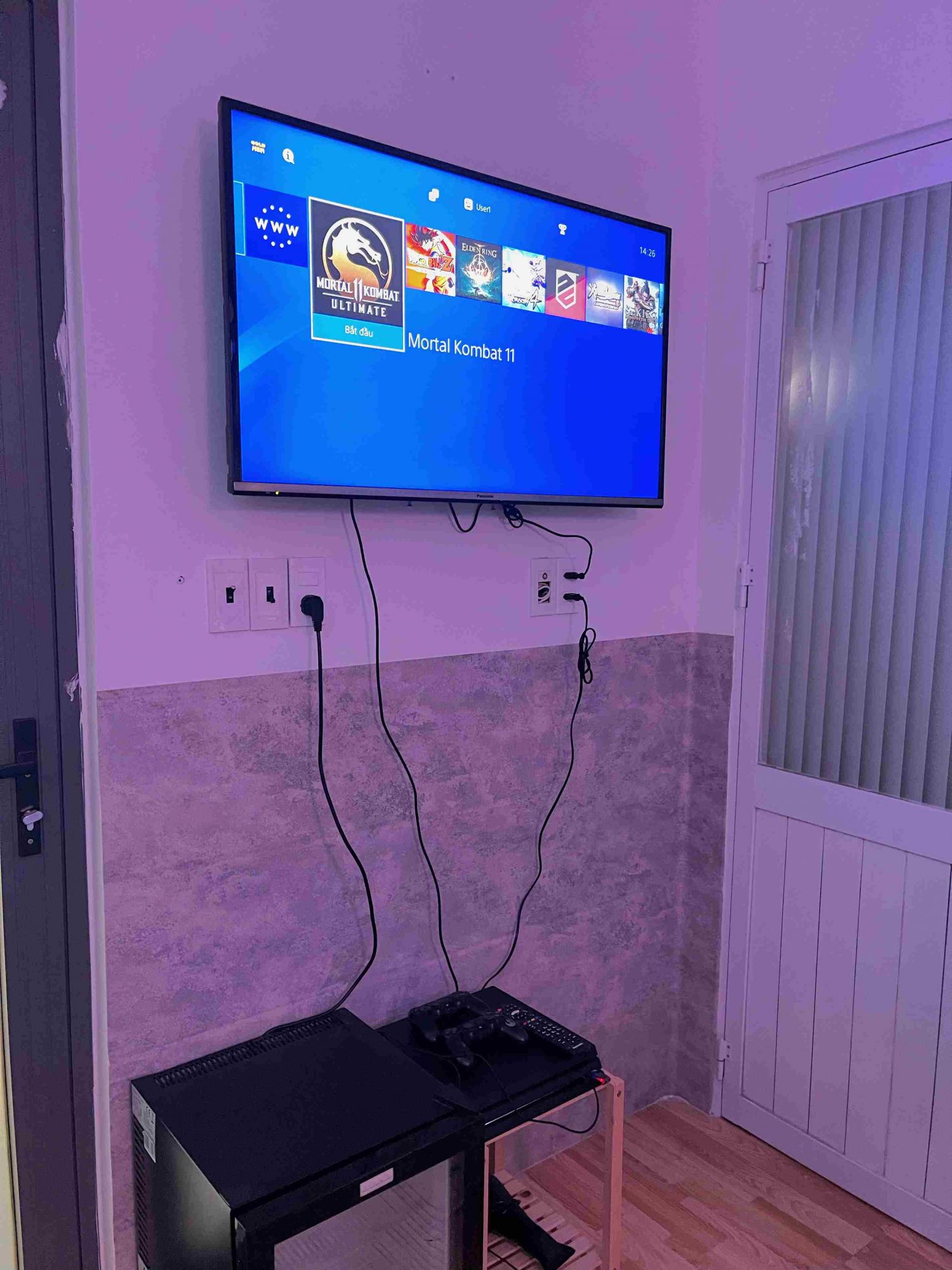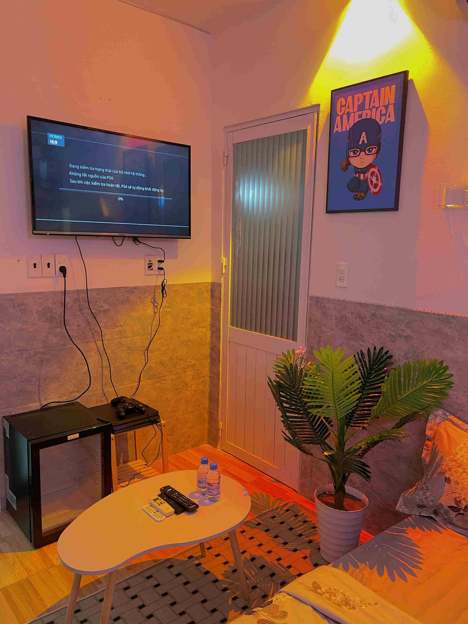 Điểm nhấn của căn phòng tại Corgi House chính là hệ thống máy chiếu phim kết hợp cùng bộ tiny PS4 – đủ để biến buổi tối trở thành một rạp chiếu mini hoặc một không gian giải trí đúng nghĩa. Thay vì phải ra ngoài tìm quán xá, chỉ cần nằm trên giường, chọn một bộ phim yêu thích hoặc cùng nhau chơi game là đã có một buổi tối trọn vẹn.