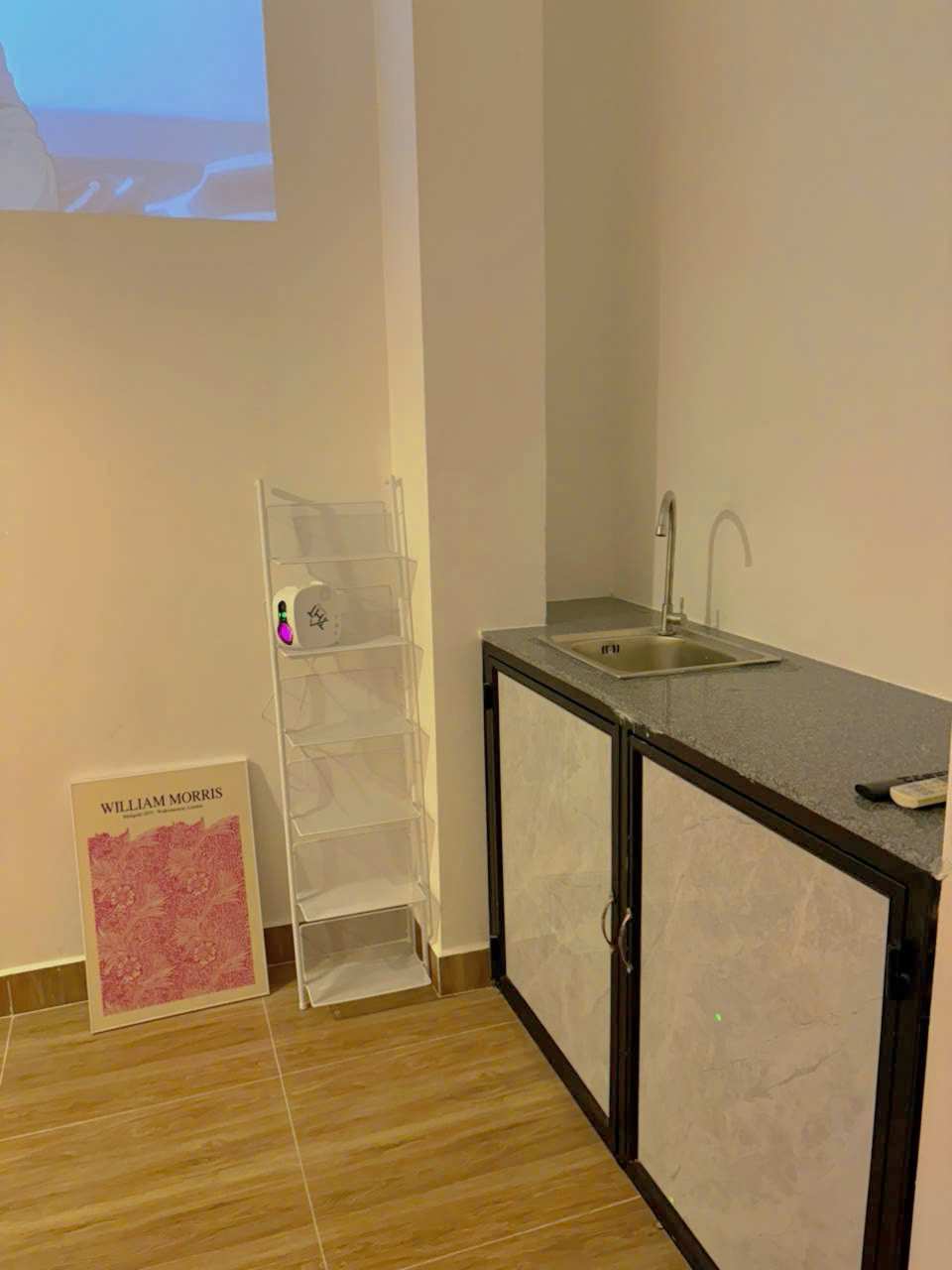Không thể thiếu trong căn phòng là khu bếp tiện nghi, được trang bị đầy đủ dụng cụ để có thể chuẩn bị bữa ăn đơn giản hoặc đồ uống yêu thích. Chút hương thơm từ bếp, tiếng nhạc nhẹ nhàng, ánh đèn ấm áp – tất cả hòa quyện thành bầu không khí đúng chất “healing” mà nhiều người tìm kiếm.