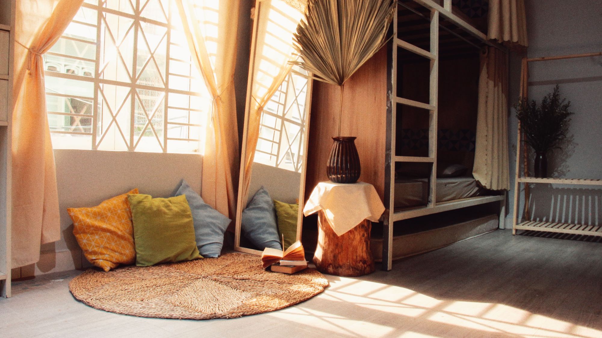 Papaya Room: Giường tầng, ban công xanh mát. Mỗi sáng thức dậy đều có thiên nhiên chào đón.
