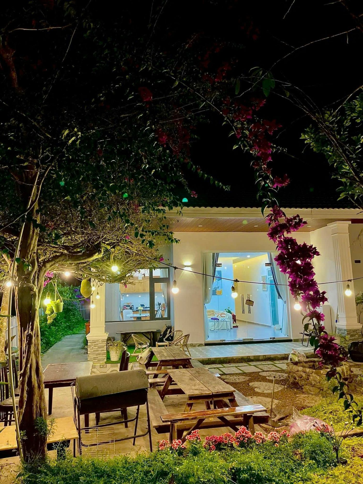 Phòng khách rộng với sofa lớn và smart TV tạo nên không gian quây quần dễ chịu. Phòng bếp được trang bị đầy đủ dụng cụ nấu ăn, bàn ăn rộng, lò vi sóng, tủ lạnh và gia vị cơ bản, đáp ứng mọi nhu cầu chuẩn bị bữa ăn của nhóm. Ngoài ra còn có sân BBQ để tổ chức tiệc tối, thưởng thức món nướng giữa khí trời se lạnh đặc trưng Đà Lạt.