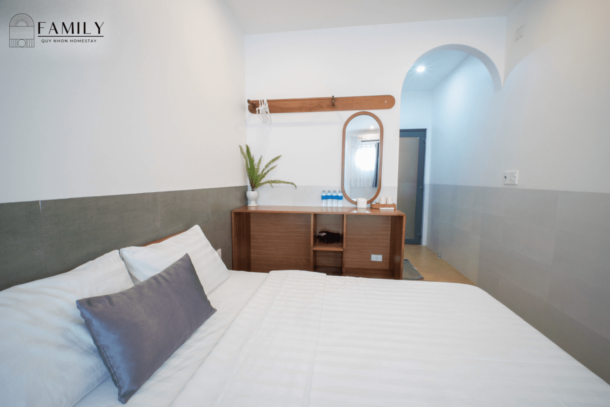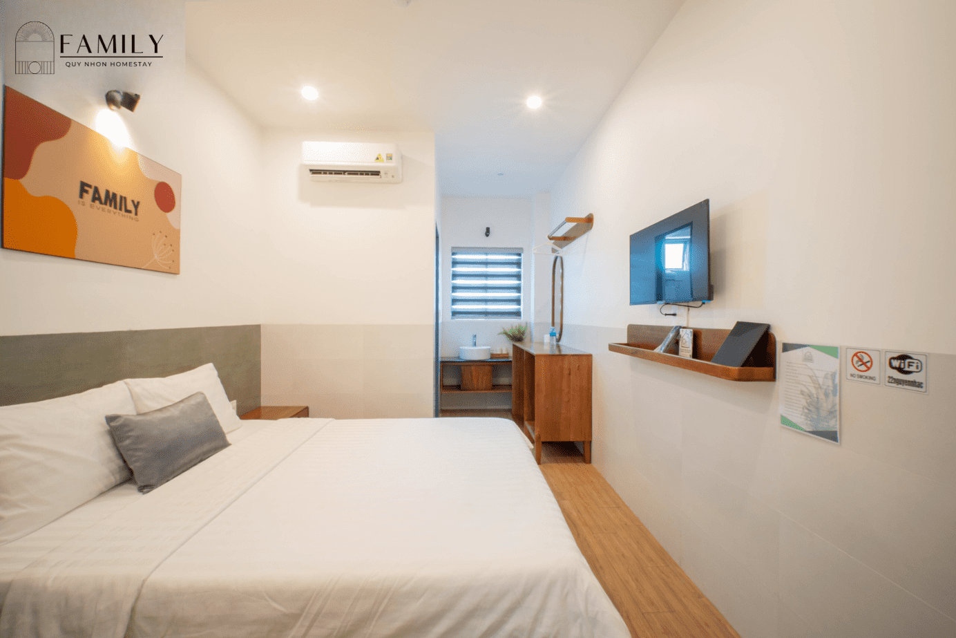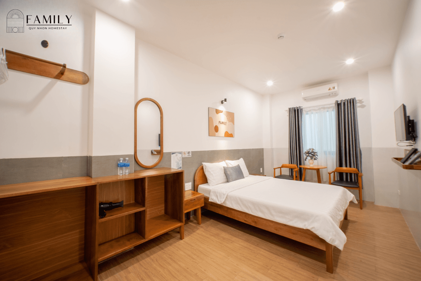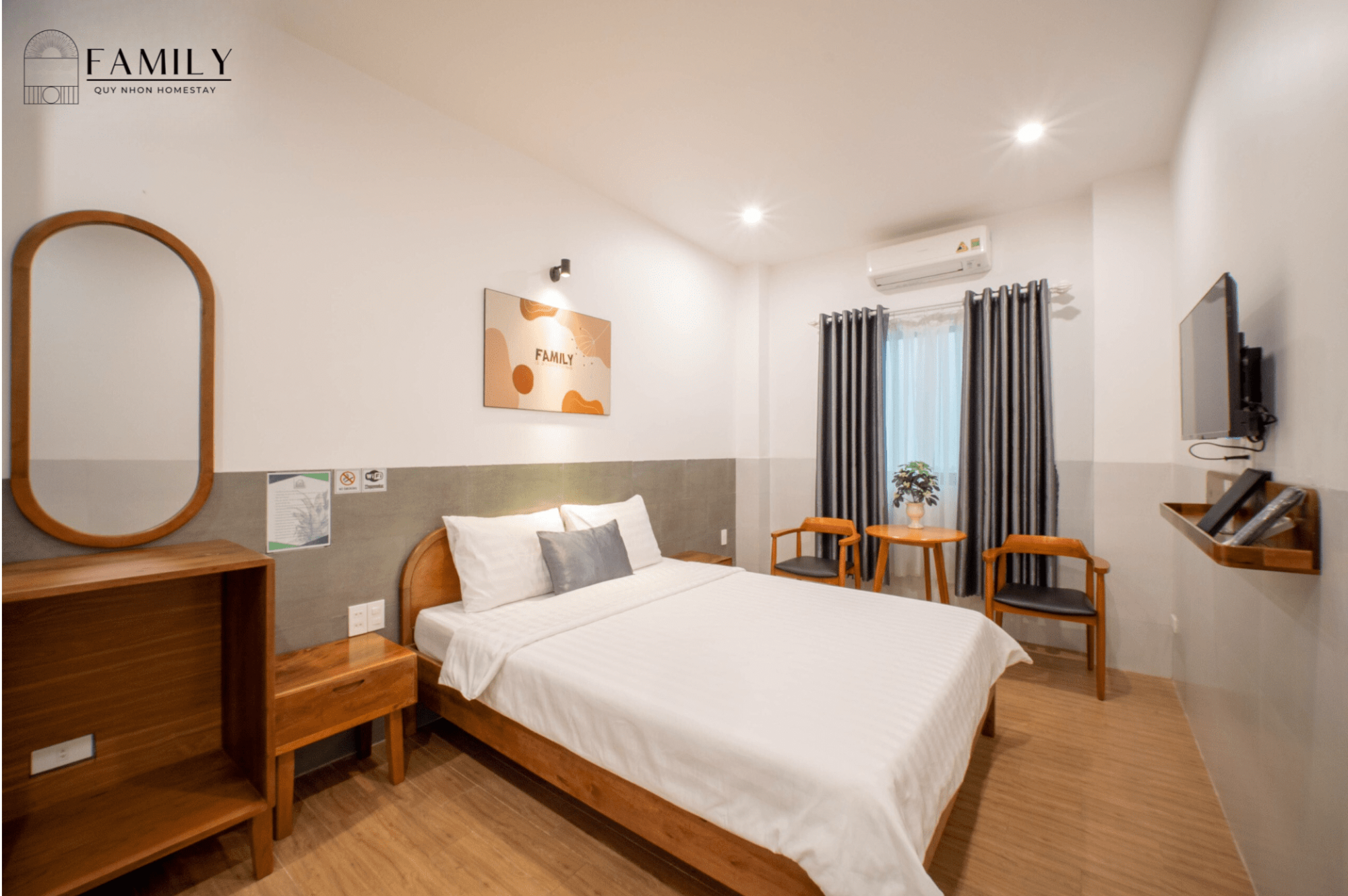 Family Quy Nhơn Homestay gồm 16 phòng ngủ bao gồm các loại phòng: phòng đôi, phòng đơn được trang bị đầy đủ các vật dụng như: máy lạnh, có sẵn ghế cao, chìa khóa riêng, vòi sen, Wifi.