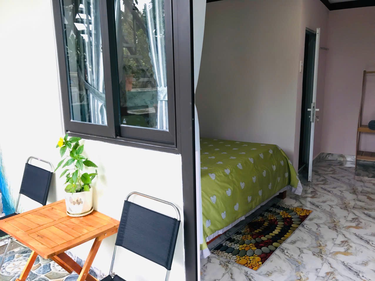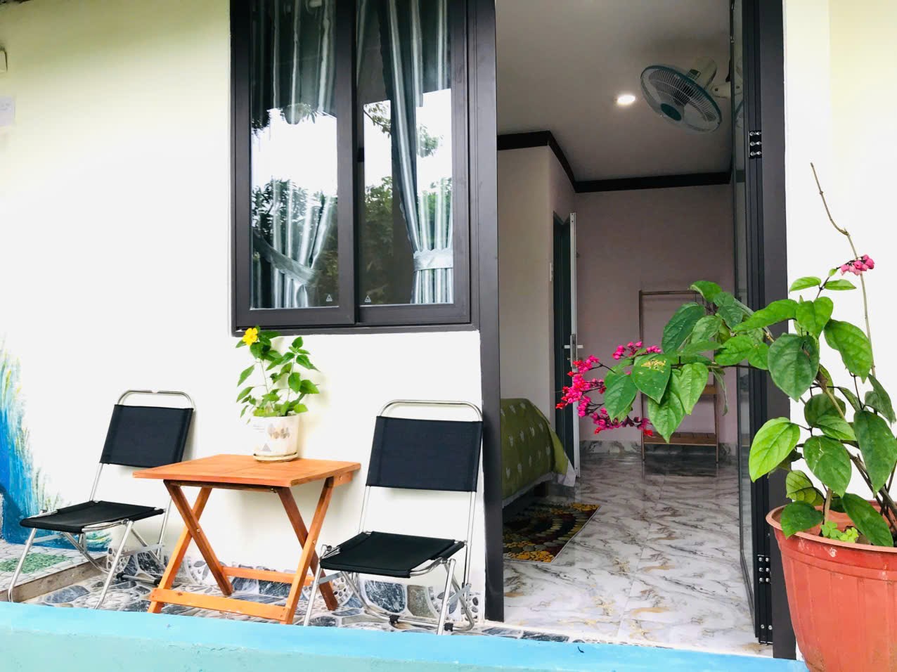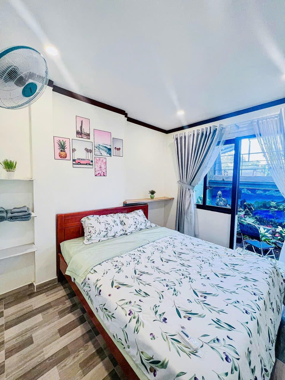 Gió Homestay nổi bật với thiết kế mộc mạc, xung quanh vườn cây tạo cảm giác gần gũi như về nhà. Không gian sân vườn nhỏ xinh với cây xanh và ghế ngồi ngoài trời mang đến không khí thoáng đãng, lý tưởng cho những buổi chiều chill ngắm hoàng hôn Pleiku.