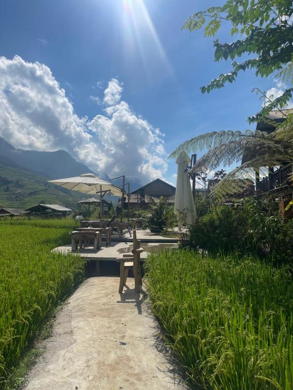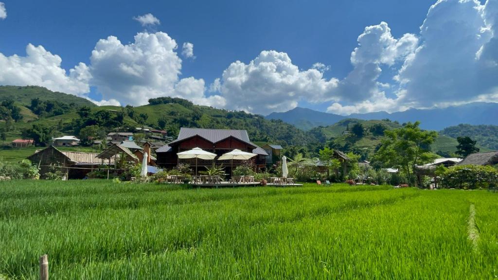 H'mong eco house được xây dựng theo phong cách nhà người H’Mông với vật liệu quen thuộc như gỗ, đá, mái lợp đơn giản. Màu gỗ trầm, những bức tường thô, khung cửa nhỏ nhìn ra thung lũng hoặc sườn núi tạo nên cảm giác gần gũi, không cầu kỳ nhưng rất có hồn. Trong sân, vài chậu hoa, chiếc ghế gỗ cũ, những tấm vải thổ cẩm phơi trước hiên khiến khung cảnh như một lát cắt đời sống thường ngày hơn là nơi lưu trú du lịch. Khi chiều xuống, ánh hoàng hôn phủ lên mái nhà, từng đường nét của bản làng trở nên mềm mại dưới thứ ánh sáng vàng cam rất đặc trưng.