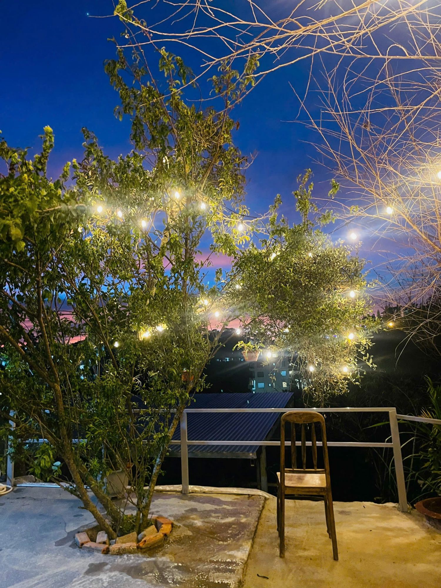 Điểm nhấn đặc biệt của Hạ Hoàng Hôn House chính là khu sân vườn rộng rãi, thoáng đãng và cực kỳ chill. Đây là nơi lý tưởng để tổ chức những buổi BBQ ấm cúng cùng bạn bè hoặc gia đình, vừa thưởng thức đồ nướng vừa tận hưởng không khí trong lành của cao nguyên. Không gian ngoài trời được bố trí hài hòa với cây xanh, mang lại cảm giác thư giãn và tách biệt khỏi nhịp sống ồn ào.