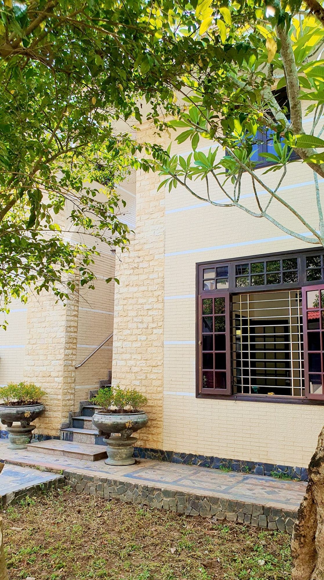 Điểm dễ nhận ra nhất tại Hoa Vàng Homestay là cách không gian được mở ra với nhiều mảng xanh. Sân vườn rộng, lối đi lát đá, cây cối được chăm chút tạo nên bầu không khí mát mẻ và dễ chịu. Không gian bên ngoài mang lại cảm giác tách biệt nhẹ khỏi sự ồn ào, giúp nhịp sinh hoạt chậm lại một cách tự nhiên. Buổi sáng, ánh nắng len qua tán cây, buổi chiều không gian dịu xuống, rất phù hợp cho những khoảng thời gian ngồi nghỉ hoặc trò chuyện nhẹ nhàng.