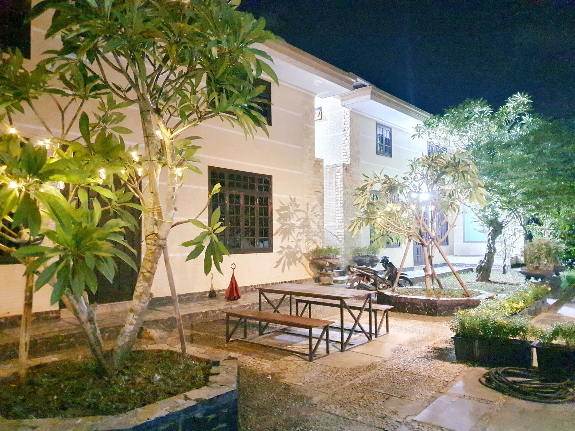 Sân vườn là một phần quan trọng trong trải nghiệm tại Hoa Vàng Homestay. Khu vực này đủ rộng để tổ chức các bữa ăn ngoài trời hoặc những buổi quây quần thân mật. Không gian mở giúp mọi hoạt động diễn ra tự nhiên, không gò bó, đặc biệt phù hợp cho các nhóm nhỏ hoặc gia đình.