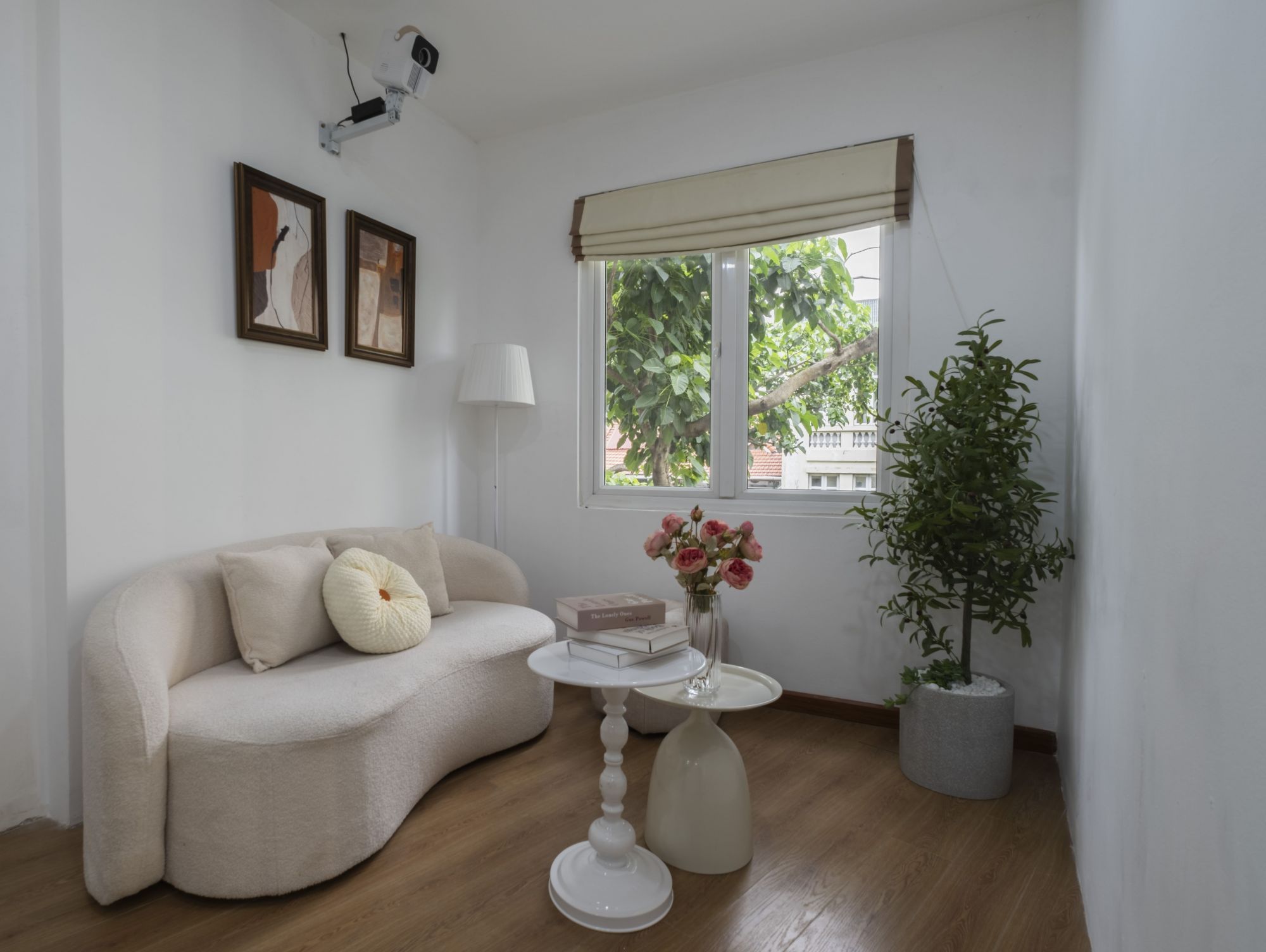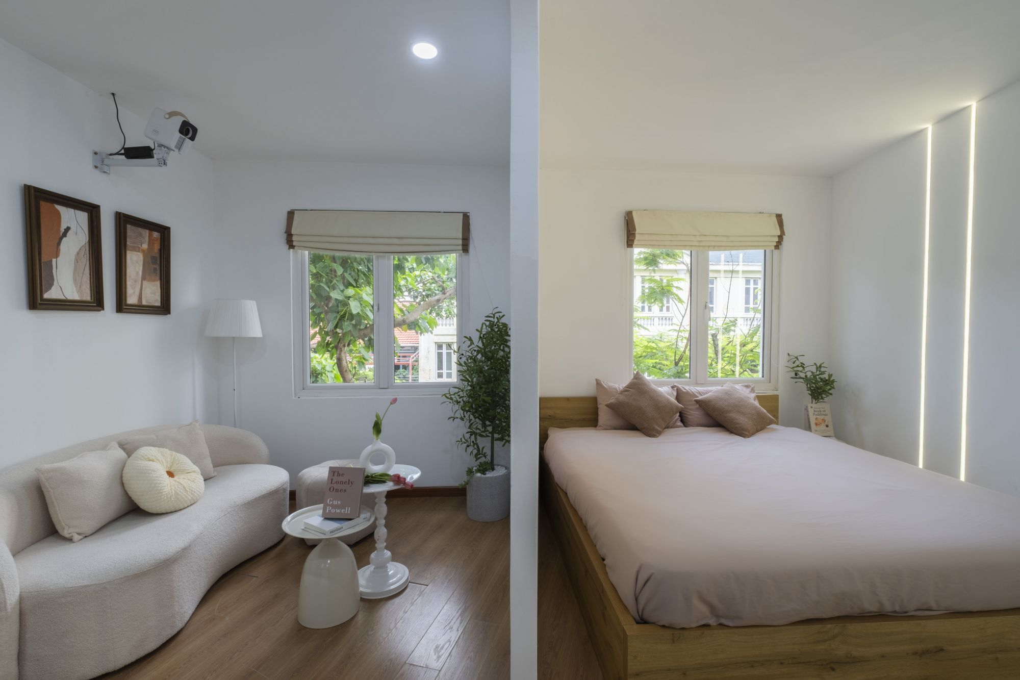 Máy chiếu hoặc Smart TV đối diện giường ngủ – tạo cảm giác xem phim như tại rạp