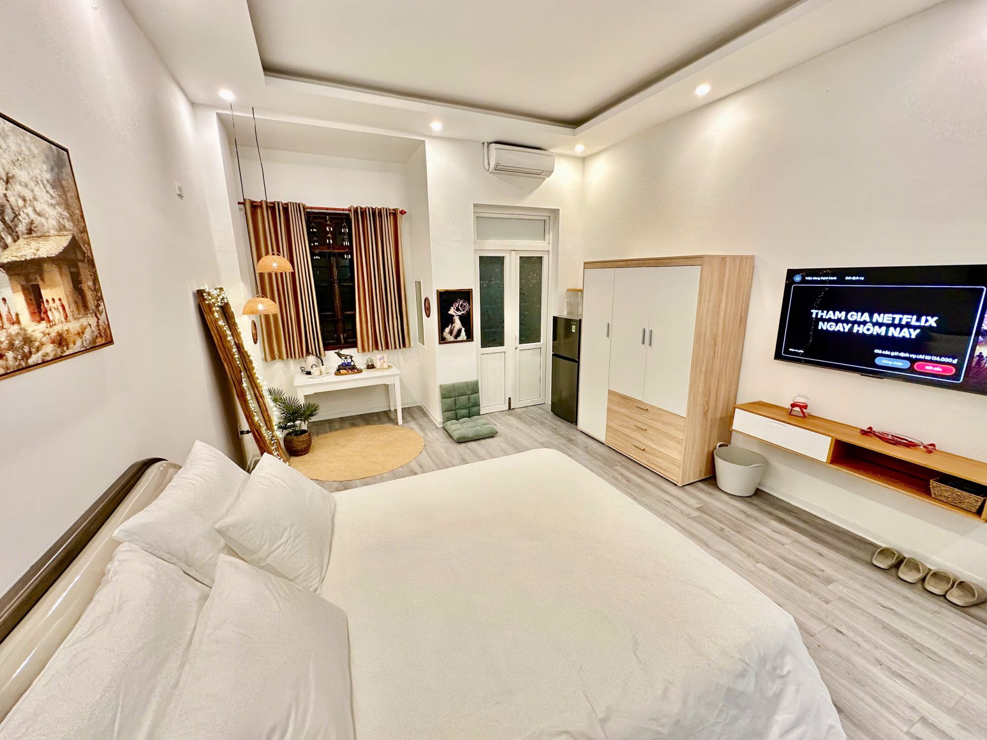 Ngoài ra, homestay còn có Netflix, Youtube, internet tốc độ cao và máy phát nhạc đa dạng, tạo thêm trải nghiệm giải trí thú vị. Sau 17h30, toàn bộ không gian trở nên riêng biệt, giúp việc sinh hoạt linh hoạt và thoải mái hơn.
