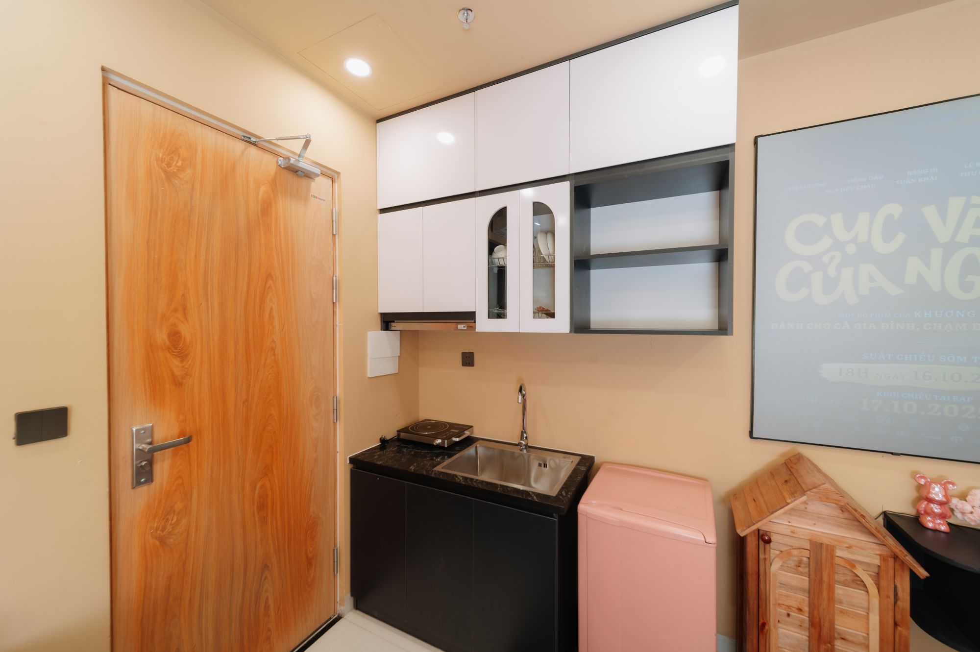 Trải nghiệm giải trí cũng là một phần làm nên sự thú vị của kỳ lưu trú. Phòng được trang bị máy chiếu Netflix, mang lại cảm giác xem phim sống động gần như rạp chiếu thực thụ. Màn hình lớn, âm thanh rõ ràng và kho phim đa dạng tạo nên một buổi tối thư giãn trọn vẹn, đặc biệt phù hợp cho những ngày muốn tận hưởng sự ấm áp ngay trong phòng mà không cần di chuyển ra ngoài.