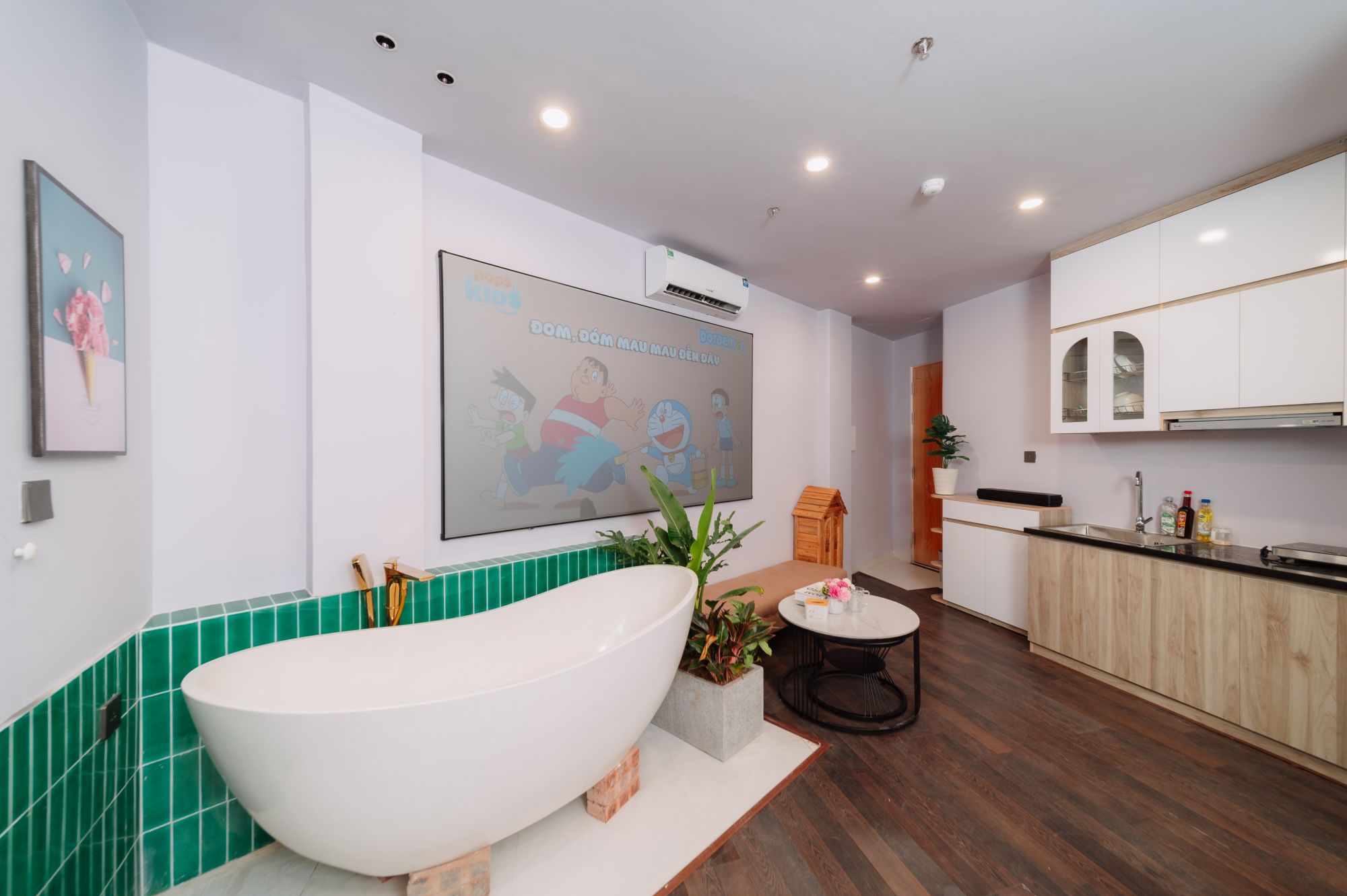 Một trong những điểm được yêu thích tại Hóng Homestay là khu vực tắm bồn – nơi tạo nên trải nghiệm thư giãn đặc biệt. Làn nước ấm ôm lấy cơ thể sau một ngày dài tạo cảm giác dễ chịu, hỗ trợ giải tỏa căng thẳng và giúp tinh thần trở nên thư thái hơn. Không gian phòng tắm được thiết kế rộng rãi, sạch sẽ và riêng tư, phù hợp cho những ai muốn tìm một góc nhỏ để thả lỏng và tái tạo năng lượng.