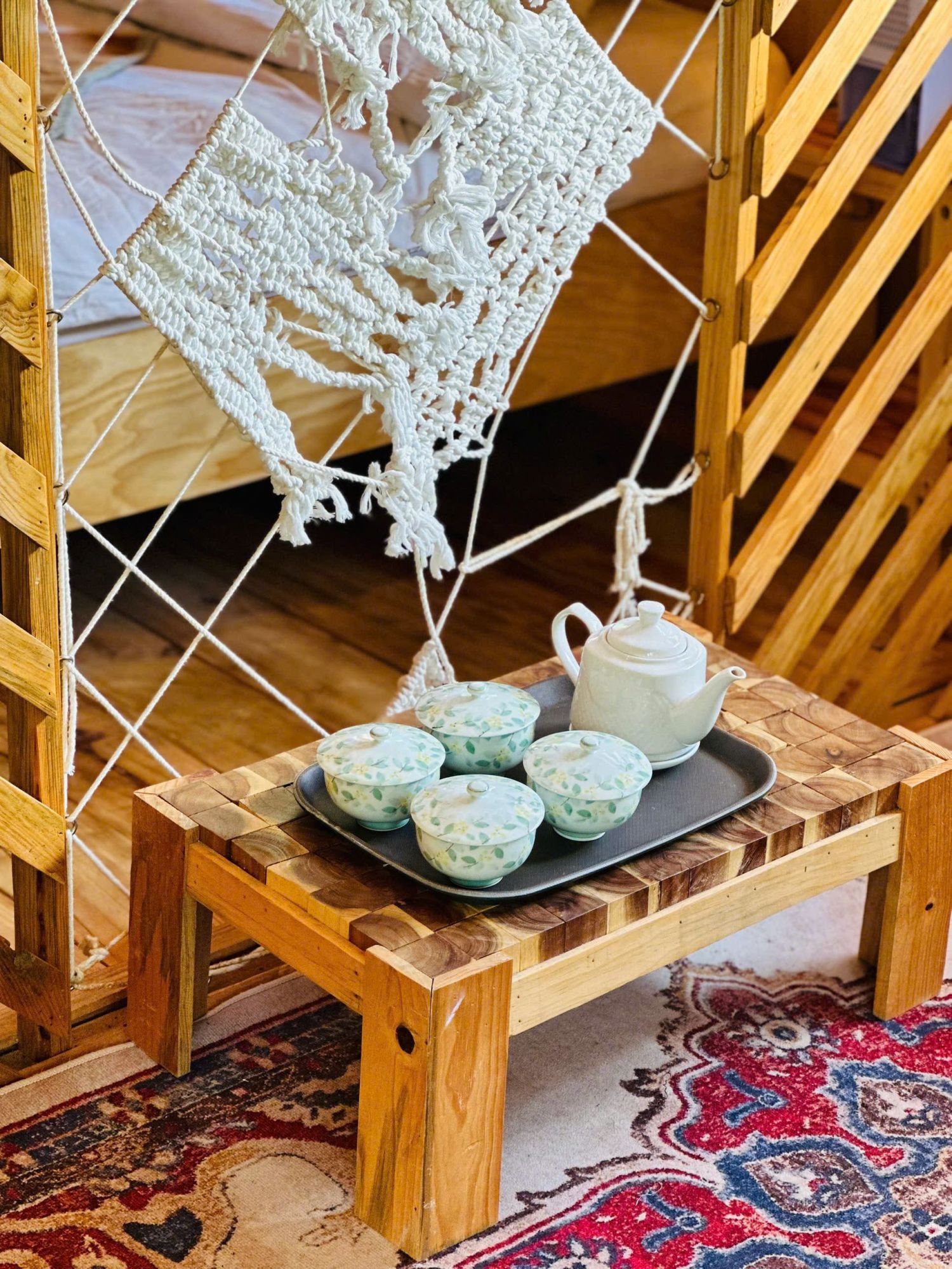 Mỗi phòng đều hướng ra rừng thông và nhà lồng, đều có công riêng để ngồi uống trà, thư giãn và ngắm cảnh núi đồi.