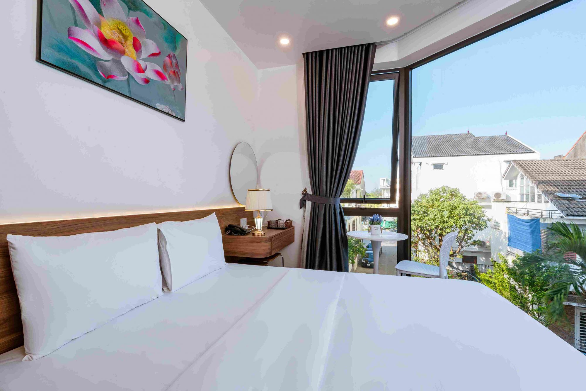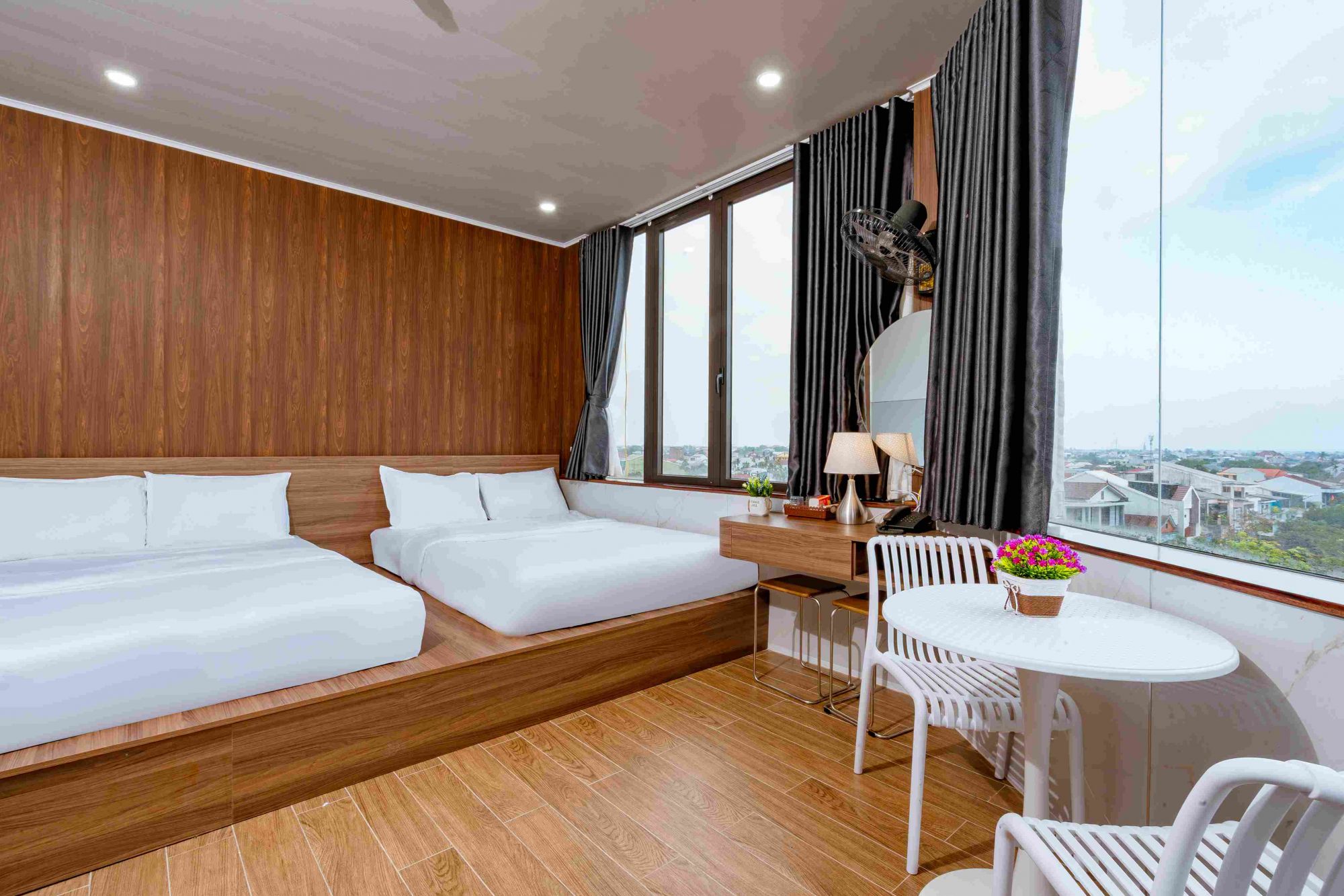 Điểm cộng dễ gây thiện cảm là tất cả các phòng đều có cửa kính lớn, đón ánh sáng tự nhiên và có thể ngắm view thành phố Huế thoáng đãng, đặc biệt dễ chịu vào buổi sáng sớm hoặc chiều tối. Không gian phòng vì thế luôn sáng sủa, thoáng và không bí bách.