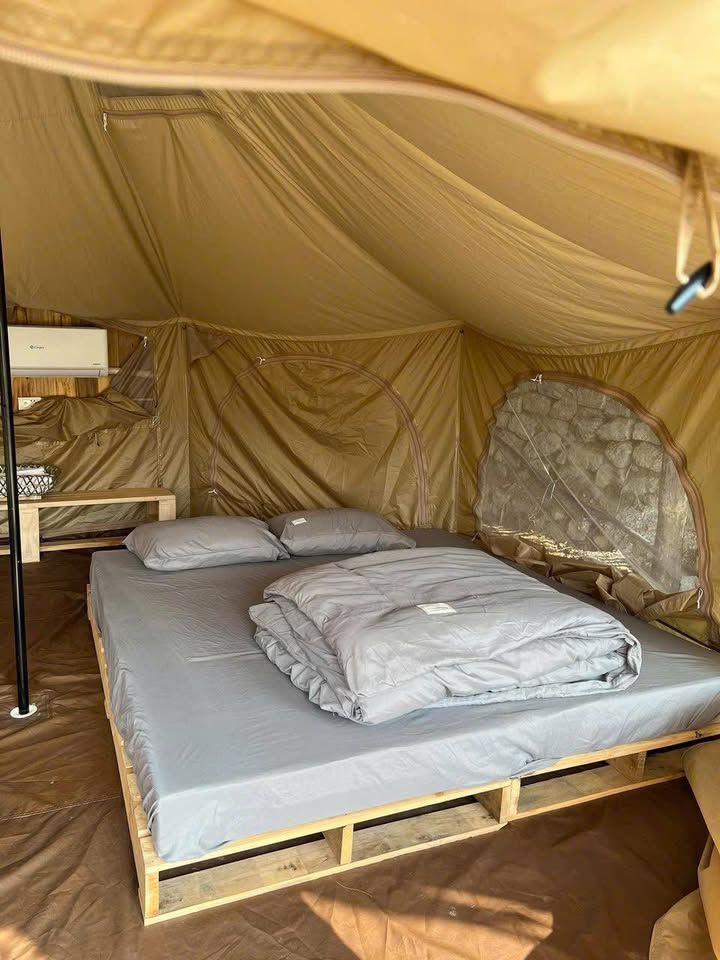 Lều được trang bị café và nước lọc miễn phí theo tiêu chuẩn phòng. Các nhu yếu phẩm như dép đi trong nhà, bộ amenities gồm dầu gội, sữa tắm, lược, kem đánh răng, bàn chải, cùng khăn tắm – khăn mặt đều được chuẩn bị chu đáo. Máy sấy tóc và điều hòa 2 chiều giúp không gian luôn giữ mức nhiệt dễ chịu trong mọi thời điểm.