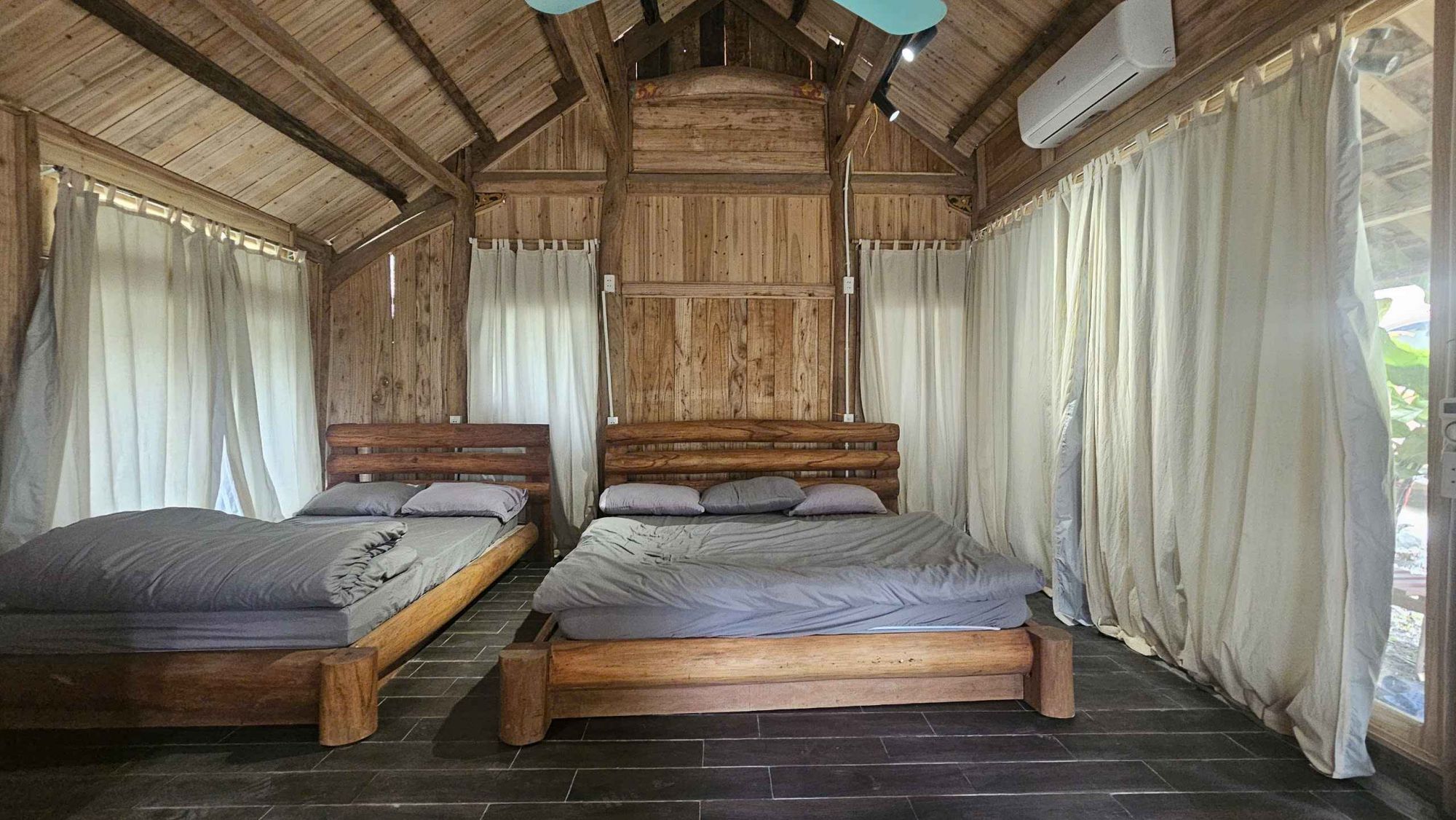 Căn phòng gồm hai giường đôi rộng rãi, phù hợp cho nhóm nhỏ hoặc gia đình muốn tận hưởng giây phút nghỉ ngơi thoải mái. Điểm nhấn nổi bật là lò sưởi trong phòng, giúp không gian thêm ấm áp vào những ngày se lạnh – mang lại trải nghiệm rất “Đà Bắc” và cực kỳ dễ chịu.