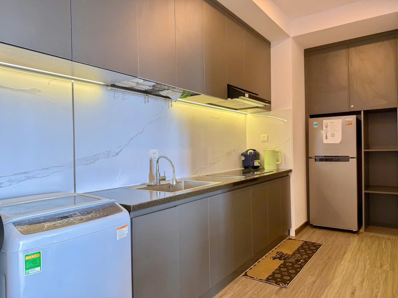 Căn hộ được trang bị đầy đủ tiện nghi: bếp từ, tủ lạnh, máy giặt, nồi cơm điện, chén bát và các vật dụng cần thiết cho sinh hoạt hàng ngày. Chỉ cần xách vali vào ở.