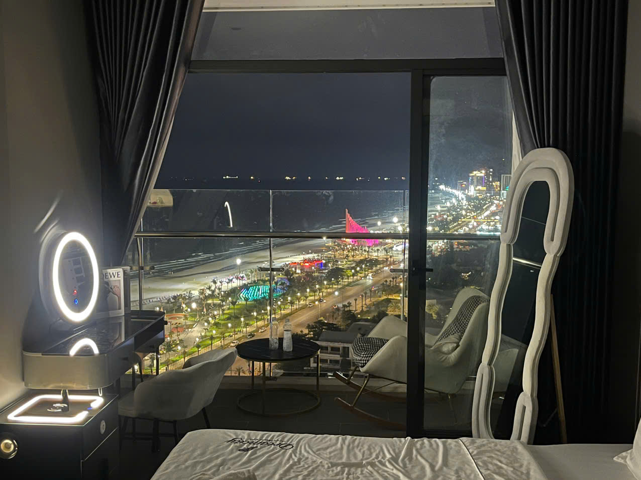Từ ban công, bạn có thể ngắm trọn view biển thoáng đãng và Tháp Tam Thắng – một trong những điểm nhấn nổi bật của khu vực. Không gian sáng, đón gió biển tự nhiên, buổi sáng ngắm bình minh, chiều thư thả nhìn thành phố lên đèn.