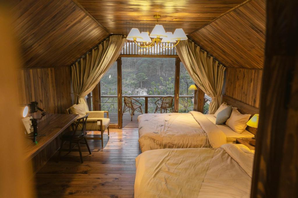 Điểm cuốn hút nhất của Ky Vien Home – Bungalow Twin chính là thiết kế không gian mở, hướng tầm nhìn ra rừng thông trải dài phía xa. Từ bên trong bungalow, khung cảnh xanh mát hiện ra tự nhiên, mang lại cảm giác khoáng đạt và thư thái. Ánh sáng len lỏi qua từng ô cửa, kết hợp cùng sắc xanh của rừng thông tạo nên một không gian dịu nhẹ, rất đặc trưng của những kỳ nghỉ giữa cao nguyên.