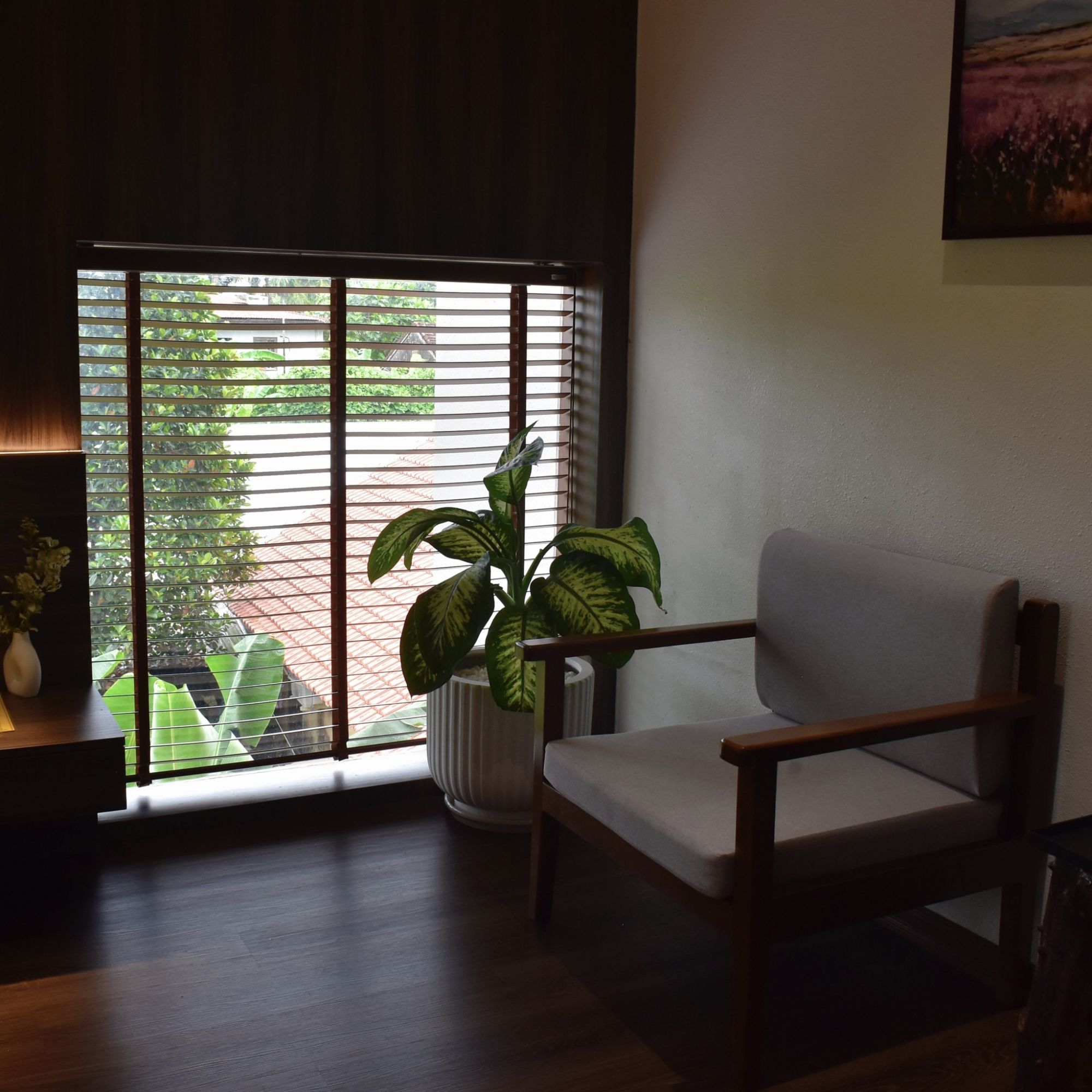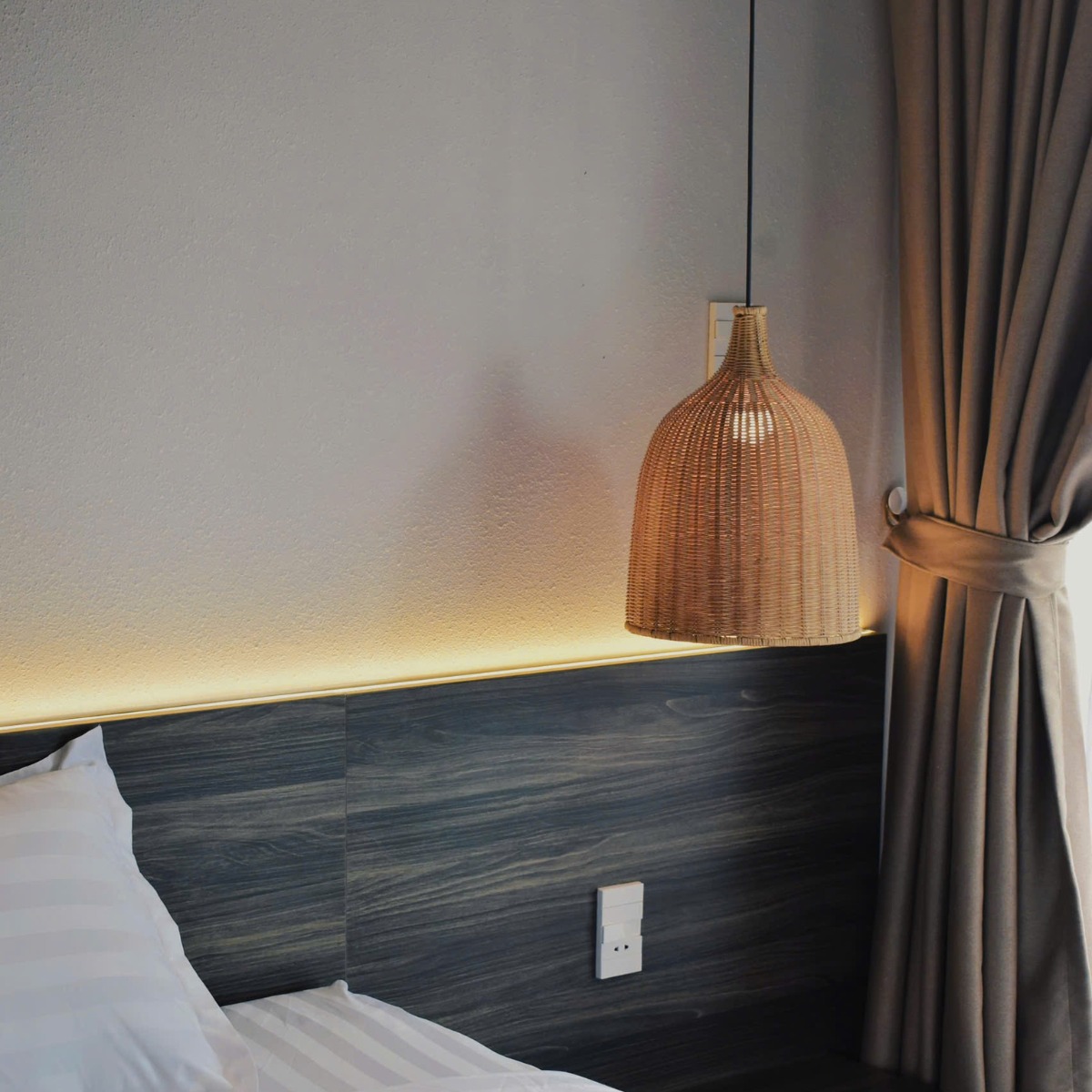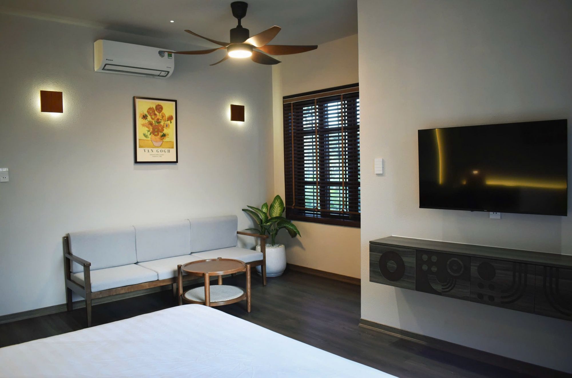 Đặc biệt, LAMIE chú trọng đến từng tiện nghi nhằm mang lại trải nghiệm trọn vẹn cho khách. Mỗi phòng đều trang bị điều hòa hiện đại, TV màn hình lớn, ánh sáng ấm áp và quạt trần giúp không gian luôn thông thoáng. Cửa sổ lớn với rèm gỗ mở ra khung cảnh thiên nhiên xanh mát bên ngoài, đón trọn ánh sáng tự nhiên, khiến mỗi buổi sáng tại LAMIE trở nên trong lành và sảng khoái.