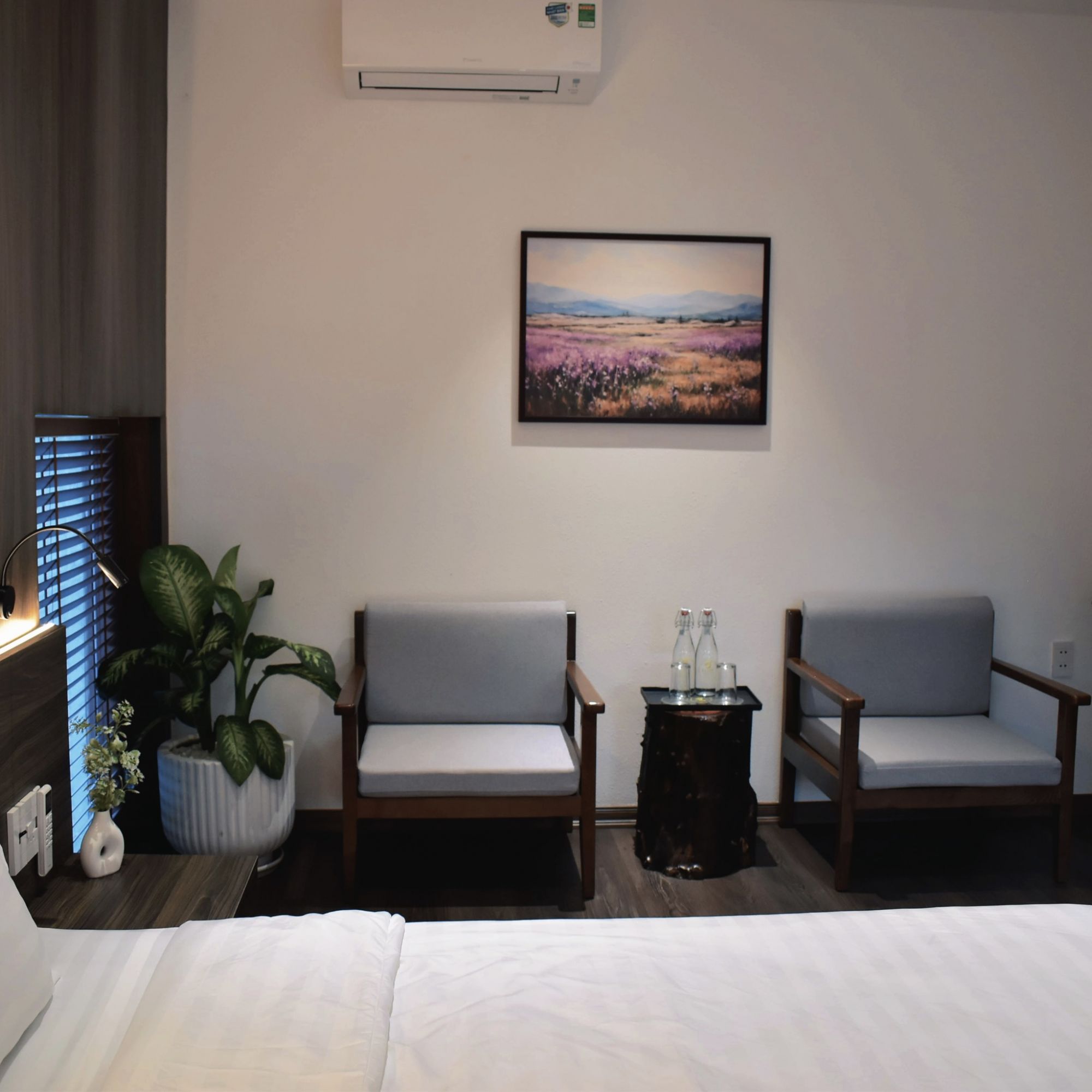Mỗi căn phòng tại LAMIE đều được chăm chút tỉ mỉ, mang lại cảm giác ấm cúng và sang trọng. Nội thất gỗ tối màu được bố trí tinh tế, tạo nên phong cách thân mật và trang nhã. Giường ngủ rộng rãi với ga gối mềm mại hứa hẹn mang đến những giấc ngủ sâu và thoải mái. Khu vực phòng khách nhỏ trong phòng với sofa êm ái và bàn trà hiện đại là nơi lý tưởng để bạn thư giãn. Không gian được điểm xuyết bằng tranh nghệ thuật và cây xanh, mang đến bầu không khí tươi mới và đầy cảm hứng.